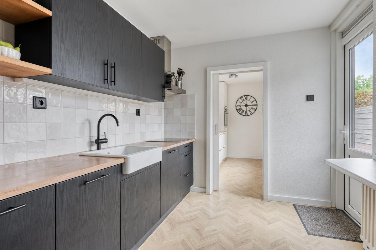 De keuken biedt een koelkast, 4-pits inductie kookplaat, afzuigkap, koelkast, magnetron, vaatwasser en diverse kasten. Een loopdeur leidt naar de tuin.