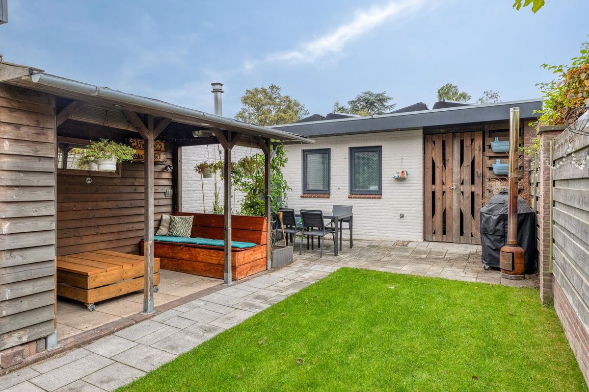 Achter in de tuin bevinden zich een stenen berging met elektra en een houten schuur, ideaal voor extra opslag. Via de achterzijde bereik je de brandgang, zodat de tuin ook via achterom bereikbaar is.