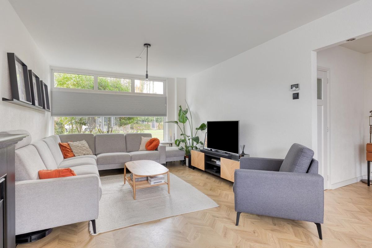 De woonkamer staat in open verbinding met de keuken aan de achterzijde.
