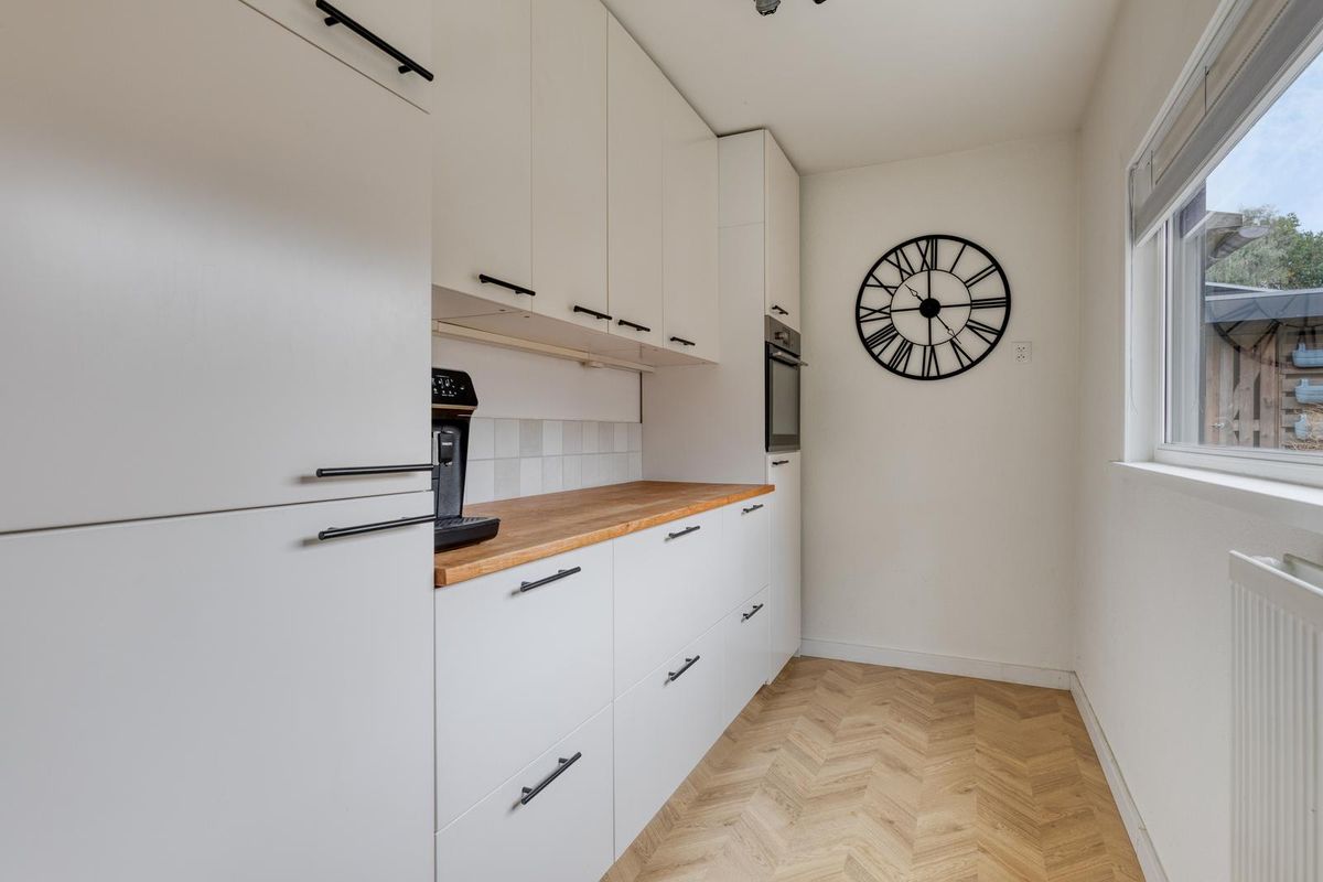 Vanuit de keuken kom je in de praktische bijkeuken met opstelling van een keukenblok met oven, vriezer en veel bergruimte.