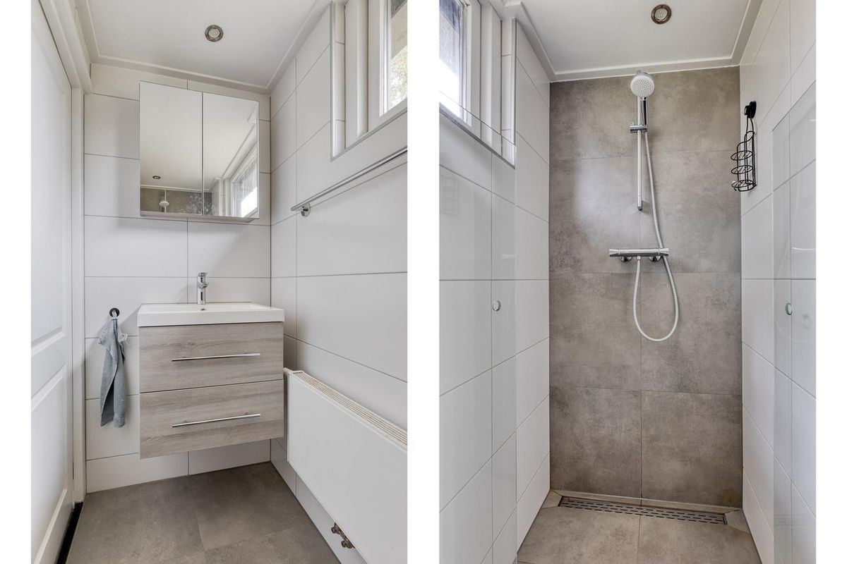 De toffe badkamer is geheel betegeld en biedt een inloopdouche en een wastafelmeubel.