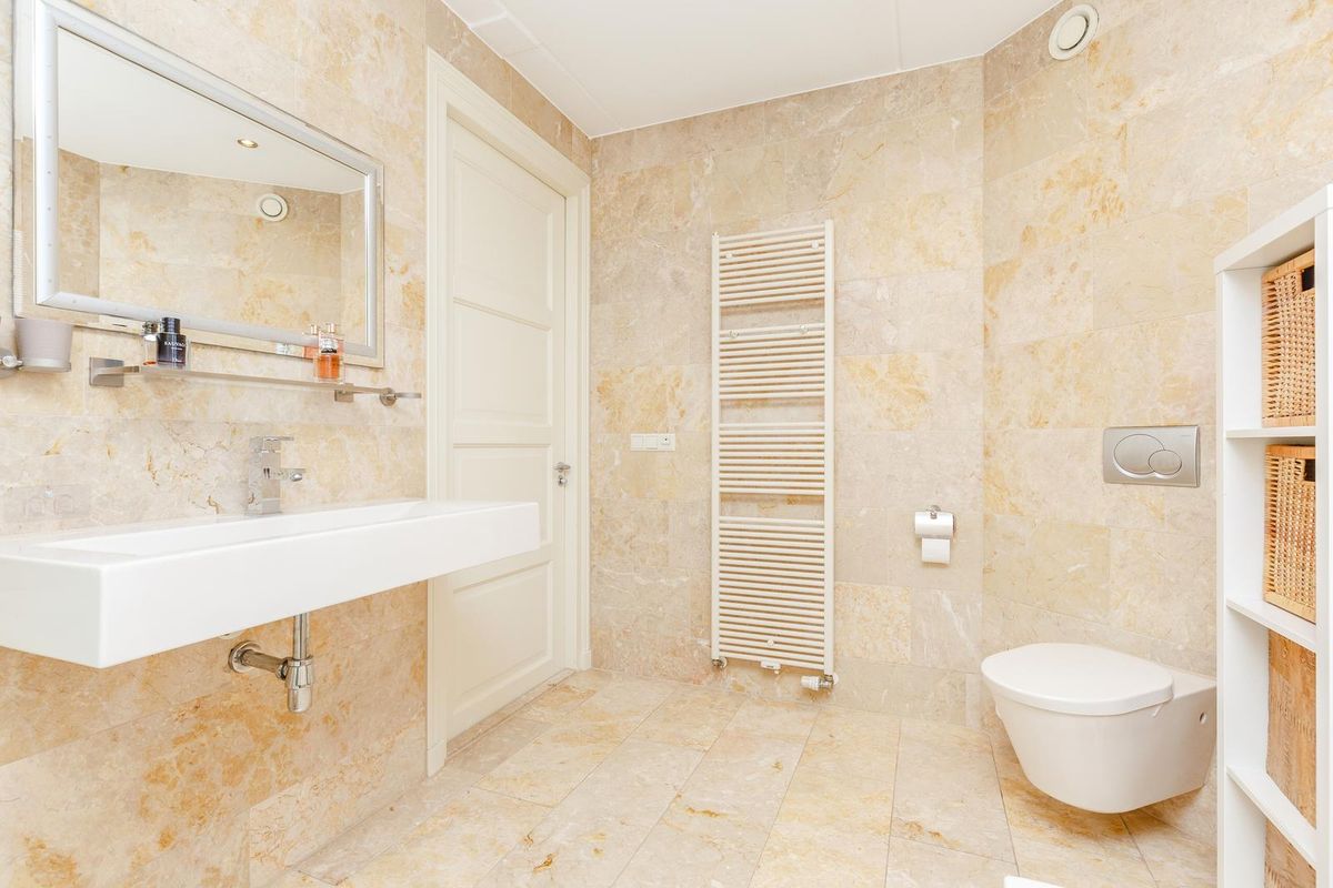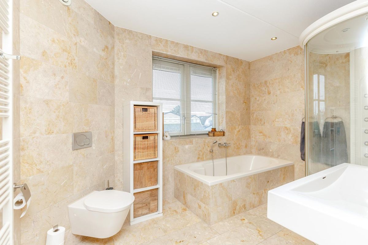 Op de eerste verdieping zijn maar liefst vier slaapkamers, waarvan één momenteel in gebruik is als kantoor. De badkamer is compleet ingericht met een ligbad, aparte douche, wastafel, vloerverwarming en tweede toilet.