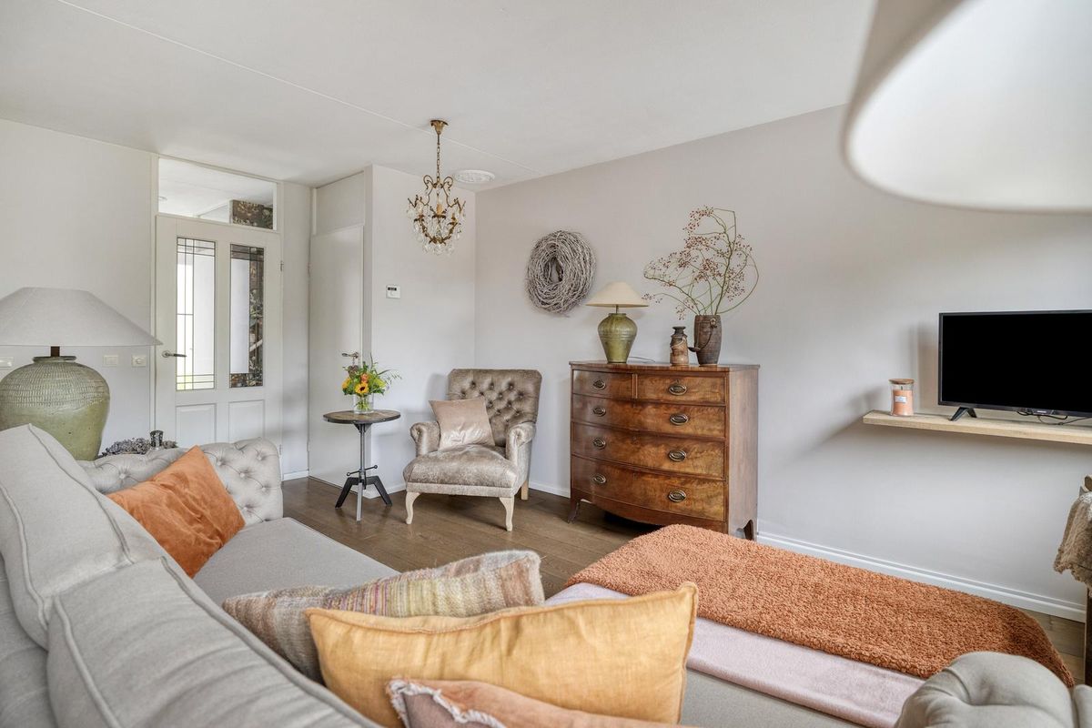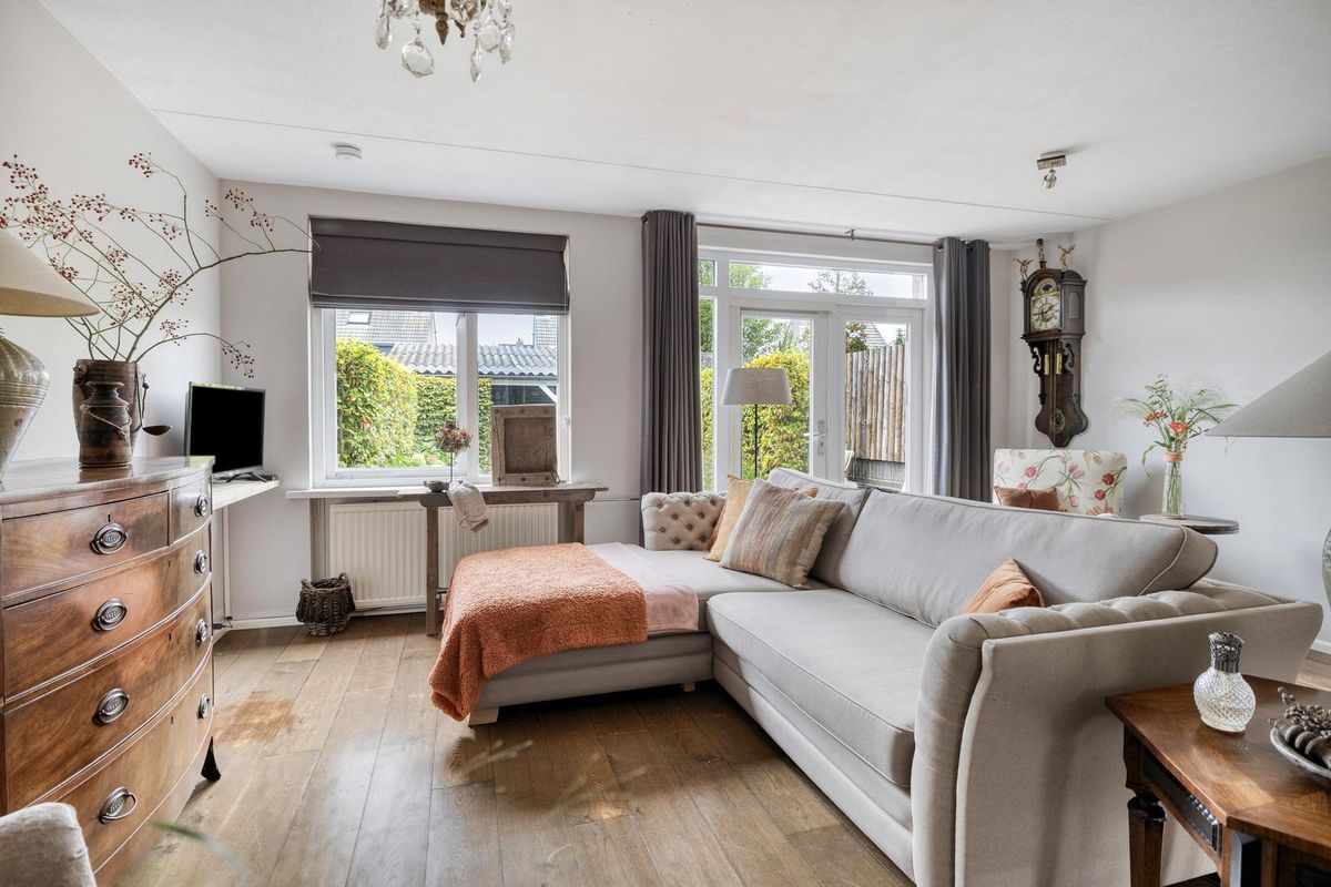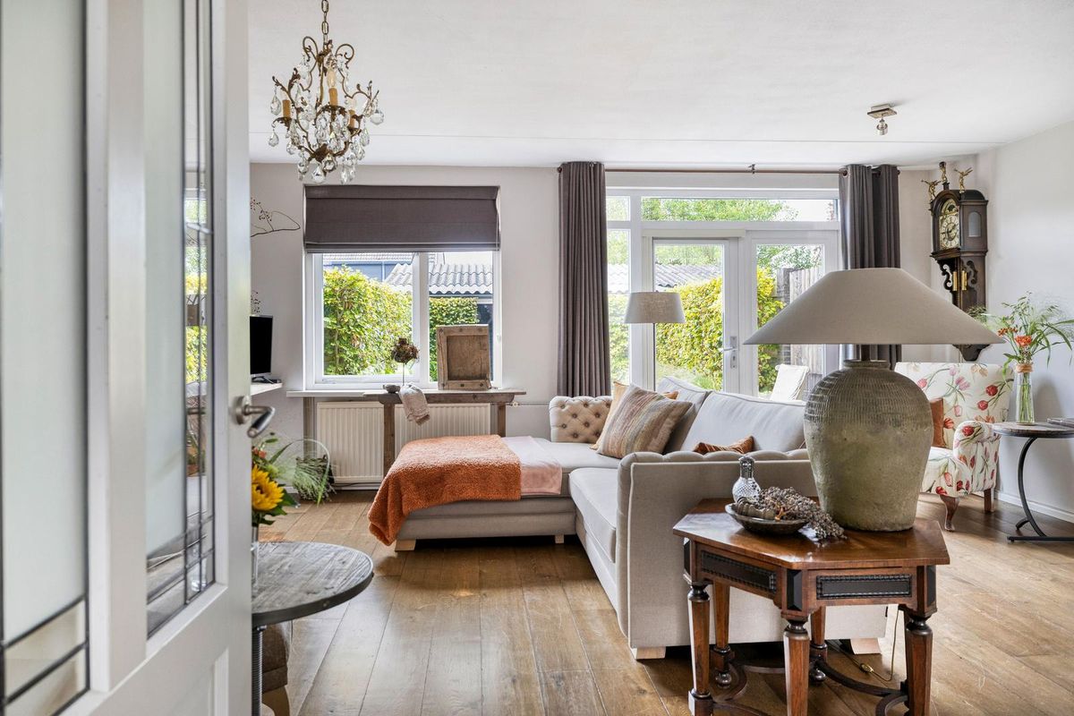 De woonkamer is voorzien van een houten vloer, stucwanden en stucplafond. De grote raampartijen zorgen voor veel natuurlijk licht en bieden een mooi uitzicht op de tuin. Dit vormt samen een fijne leefruimte waar comfort en sfeer samenkomen.
