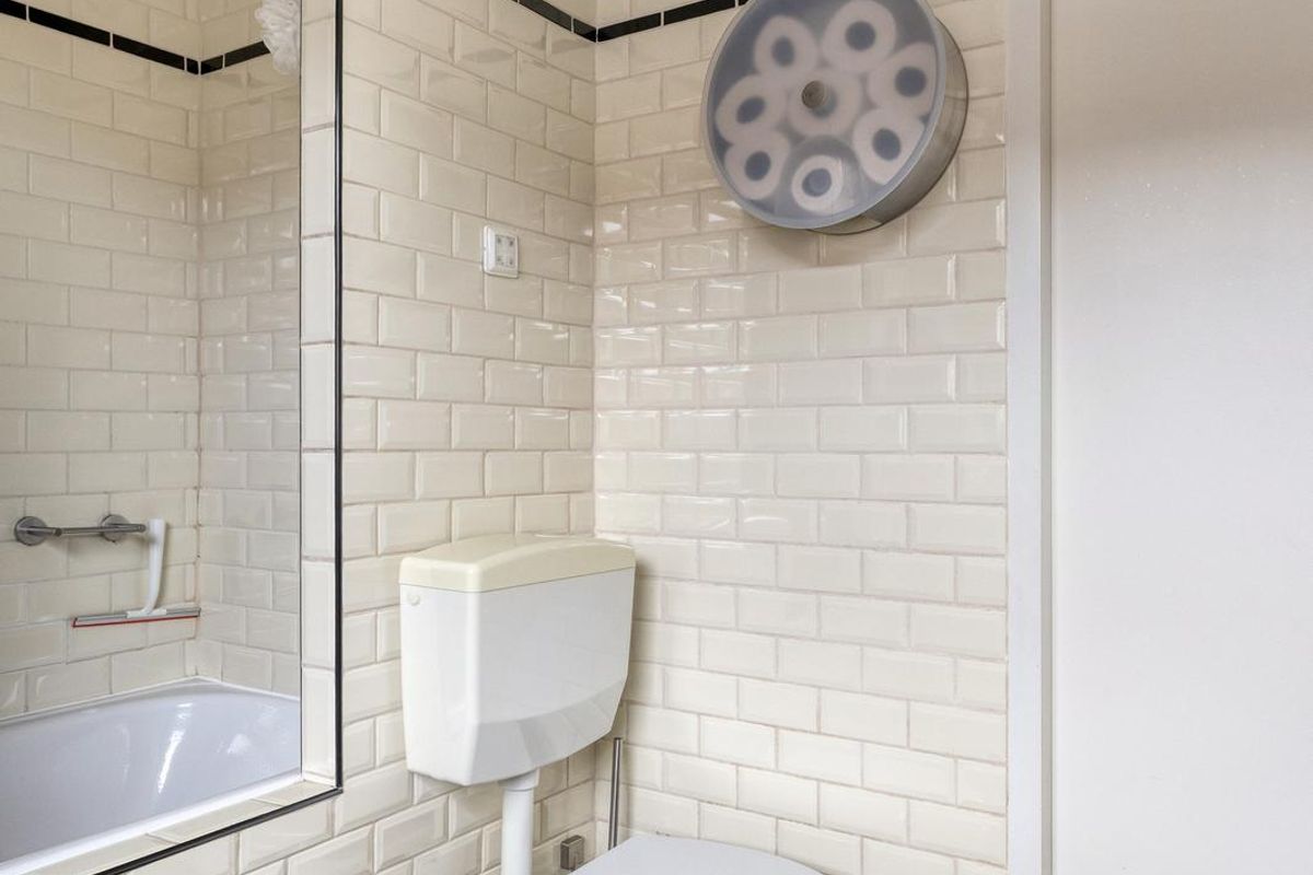 De badkamer is geheel betegeld en biedt een bad, closet en een wastafelmeubel met dubbele waskommen.