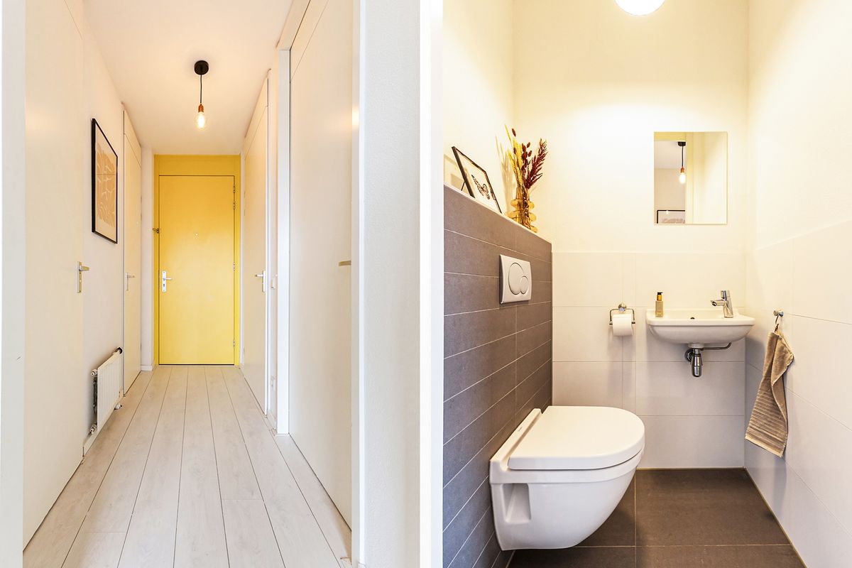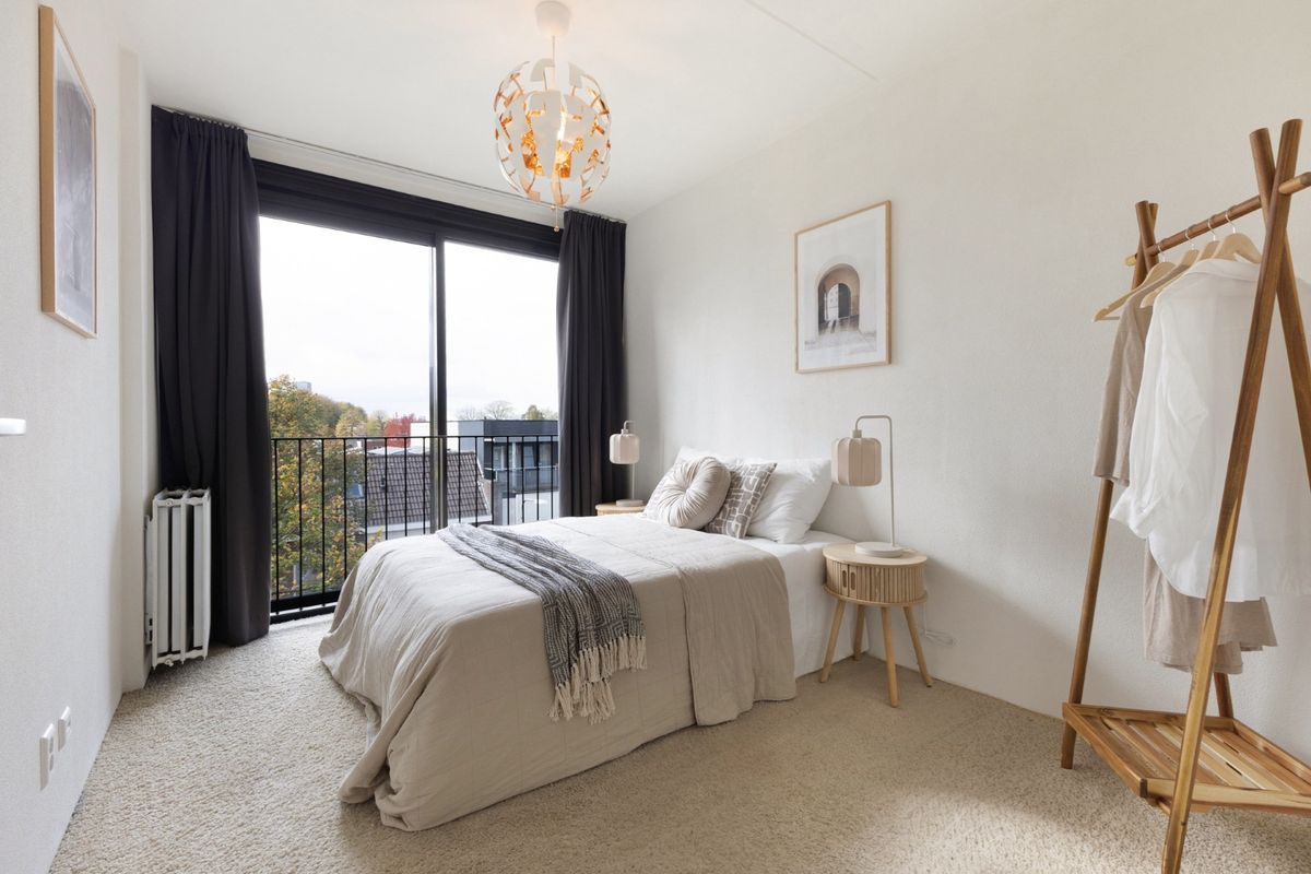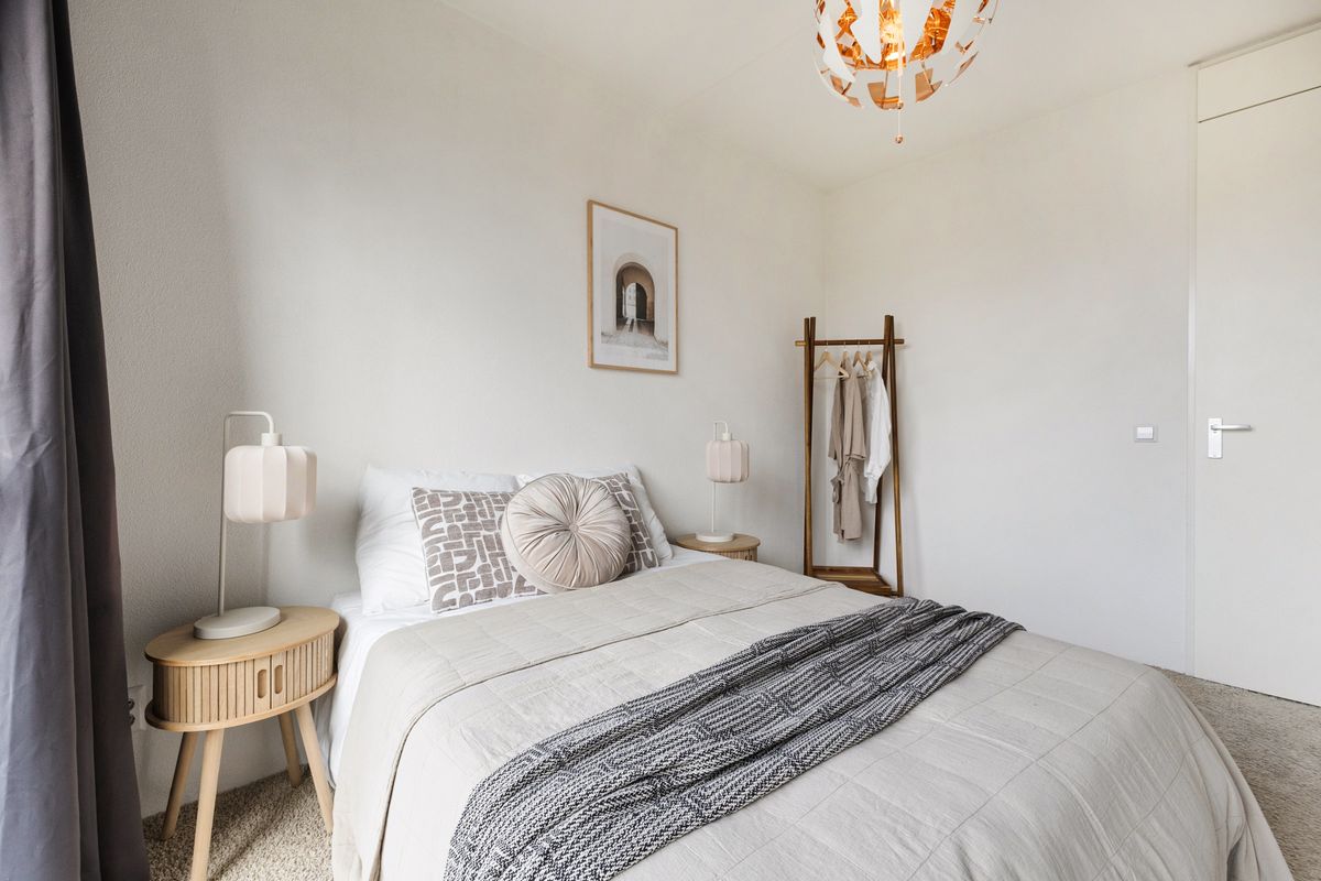 Wanneer je de deur van het appartement opent, stap je binnen in de nette entree. De hal biedt achtereenvolgens toegang tot de toiletruimte met hangend closet en fonteintje, bergkast met wasaansluiting, de woonkamer, badkamer en de slaapkamer. Laten we beginnen bij het laatstgenoemde.