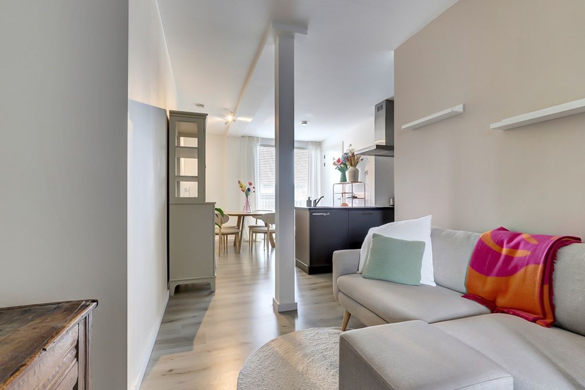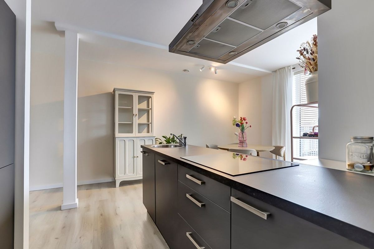 De woonkamer is aangenaam licht en sfeervol dankzij de grote raampartij aan de voorzijde van de woning. In het midden van de ruimte bevindt zich de moderne open keuken, voorzien van een vaatwasser, combi-oven, koelkast met vriesvak en een inductiekookplaat.
