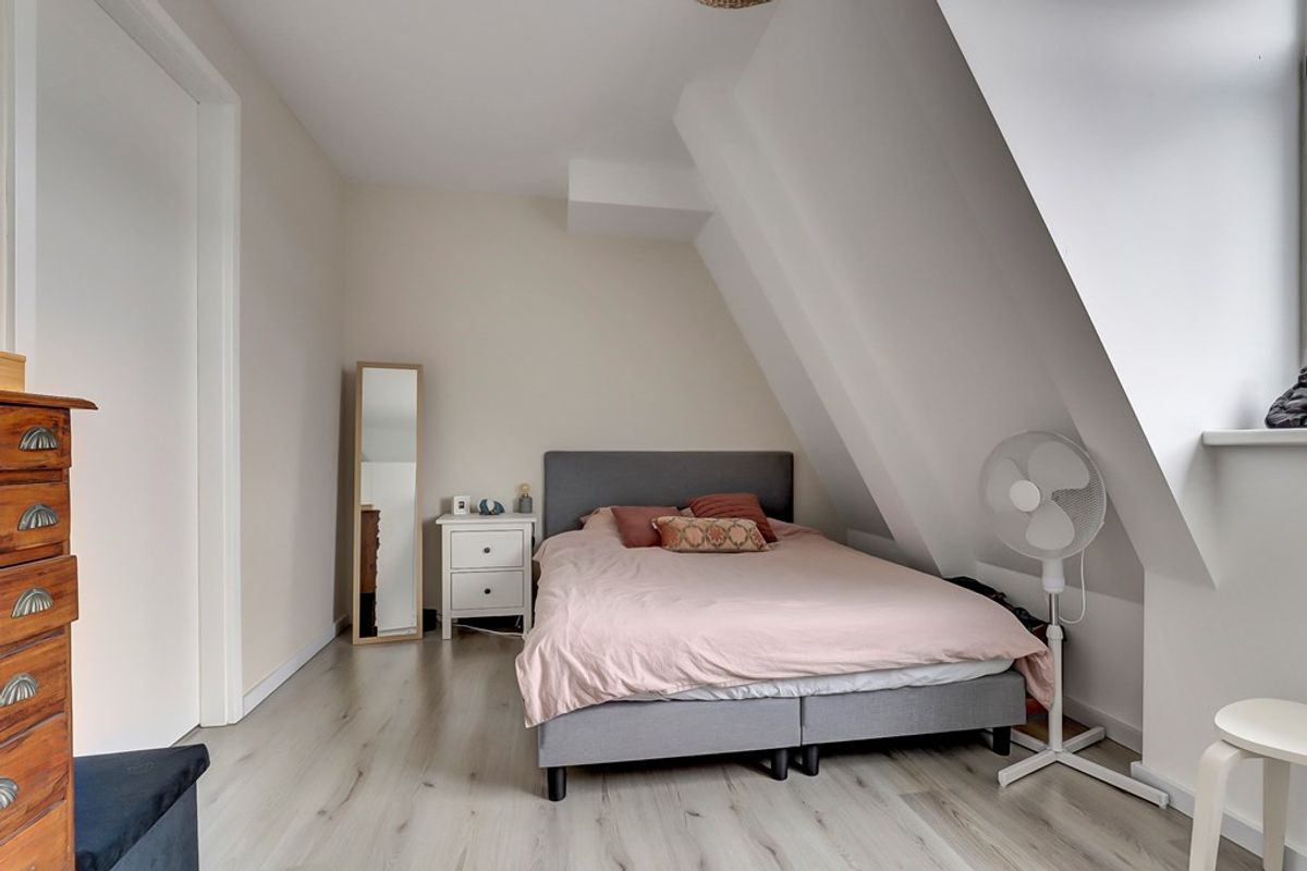 Aan de achterzijde van de woonkamer ligt de slaapkamer, die voldoende ruimte biedt voor een tweepersoonsbed en een royale kast.