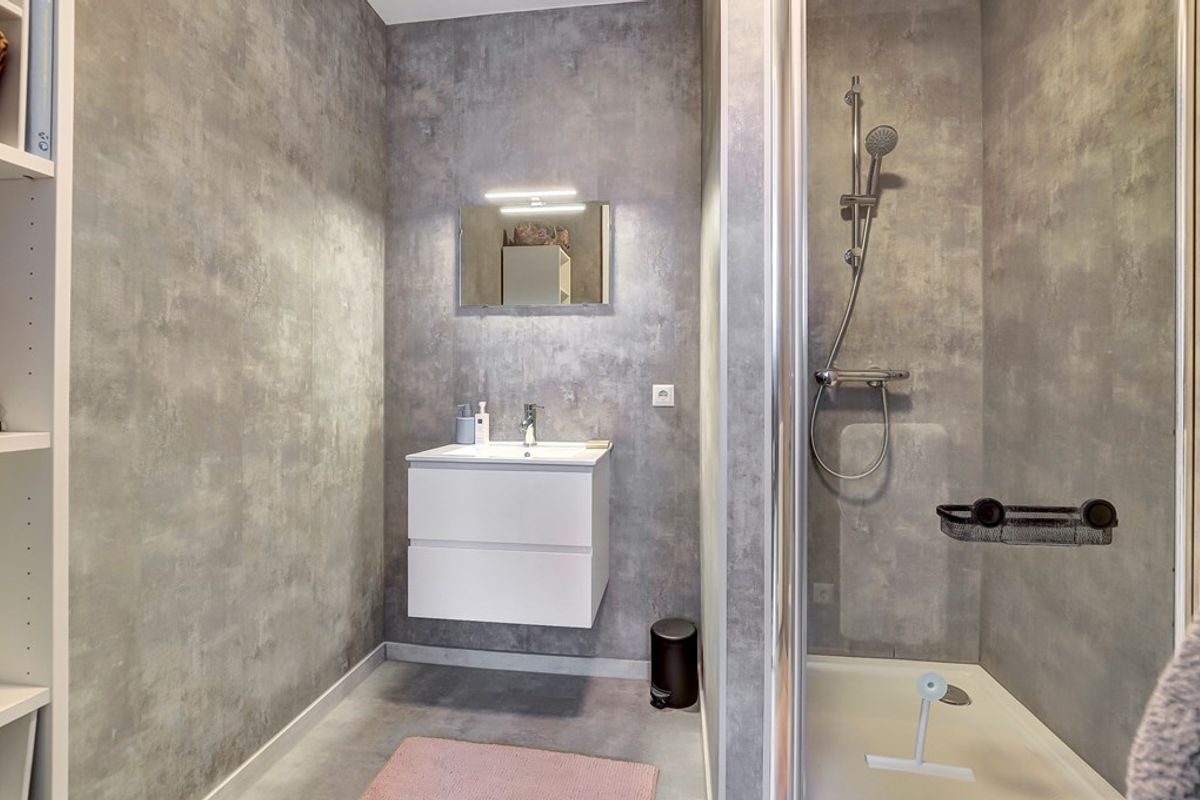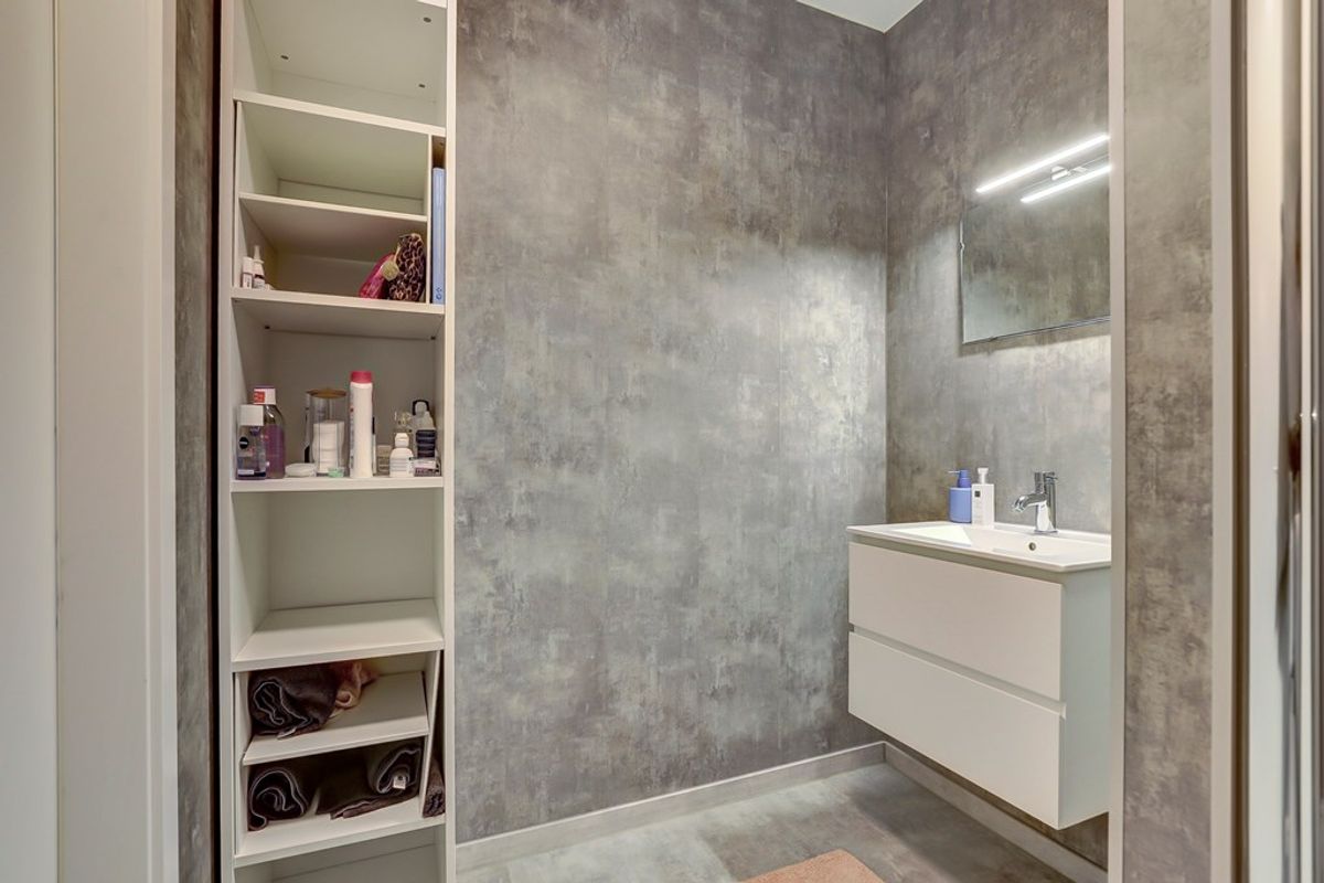 Vanuit de slaapkamer is de moderne badkamer bereikbaar, uitgerust met een douche en een stijlvol wastafelmeubel.