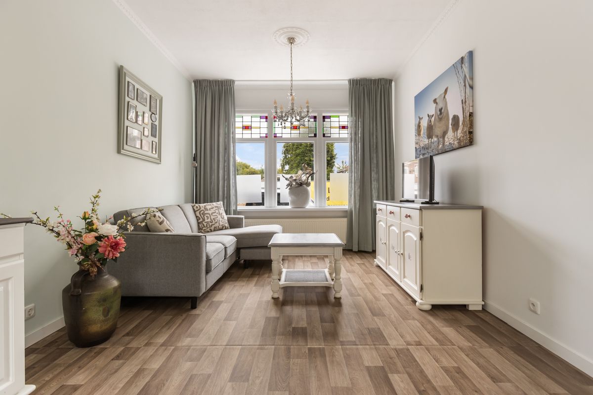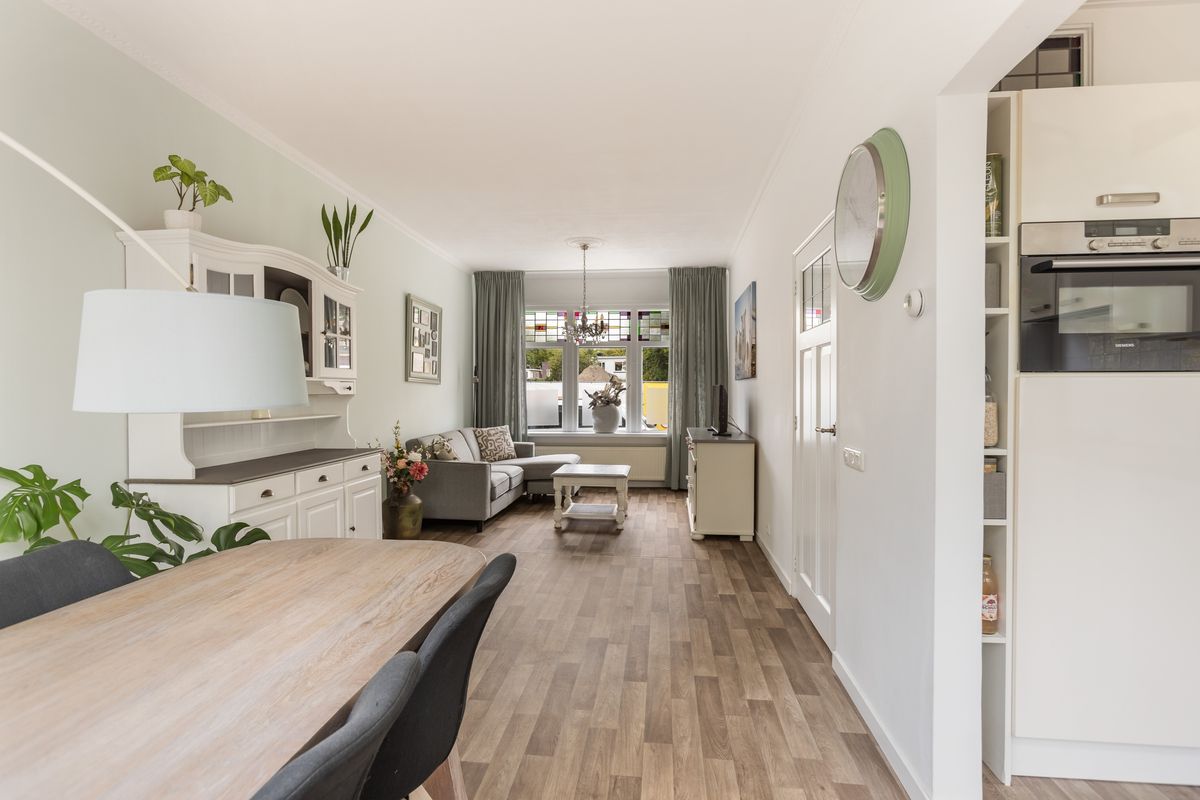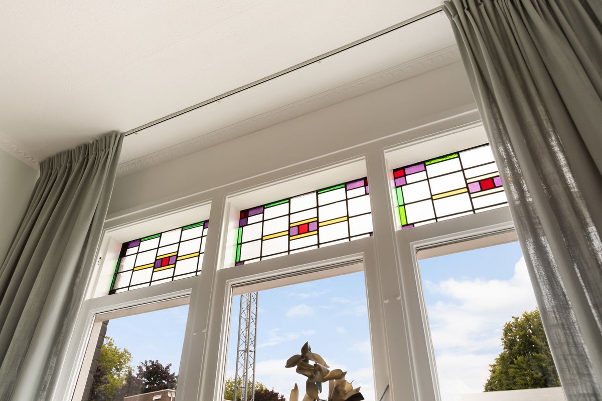 De ruime woonkamer beschikt over een zit- en eetgedeelte met veel lichtinval dankzij de grote raampartijen. De kozijnen zijn aan de bovenzijde afgewerkt met glas-in-lood, wat zorgt voor een eigentijdse maar karaktervolle uitstraling. Aan de achterzijde geven dubbele openslaande deuren, eveneens voorzien van glas-in-looddetails, toegang tot de zonnige tuin. De houten vloerconstructie is grotendeels vervangen door stalen balken.