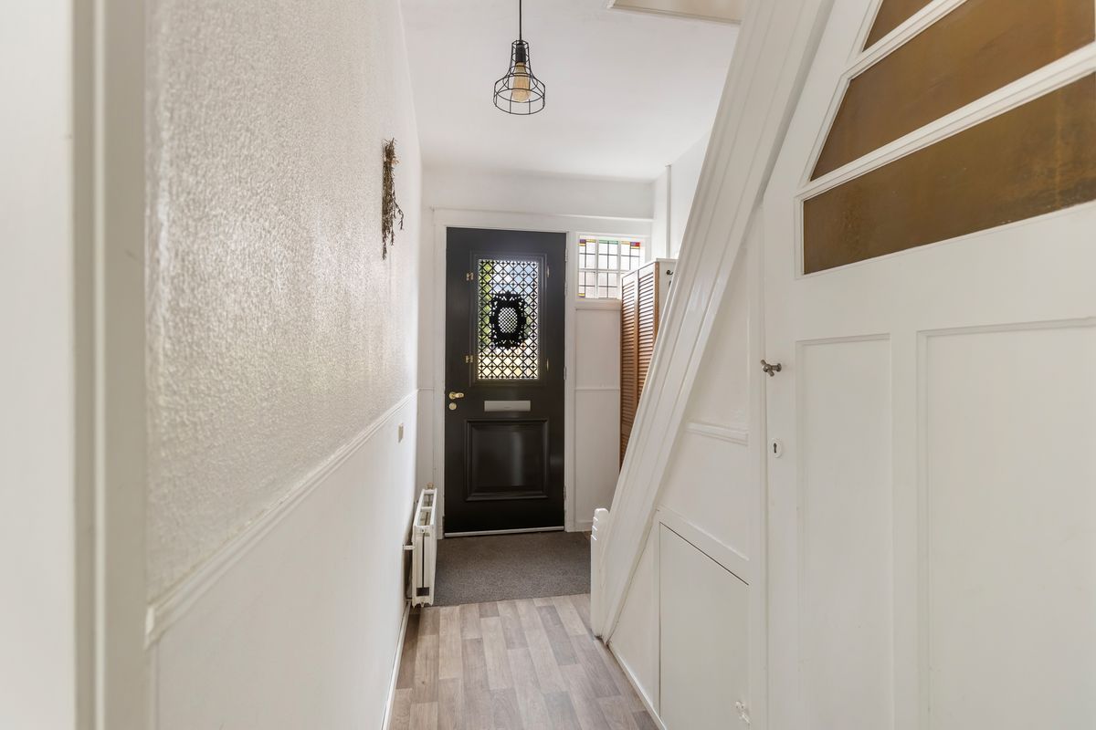 Via een fraaie hardhouten voordeur met gietijzeren rooster en de hal treed je de woning binnen. In de hal vindt je de meterkast (6 groepen en glasvezelinternet), trapopgang naar de eerste verdieping, het toilet, handige bergkast en toegang tot de woonkamer. De hal is voorzien van fraaie glas-in-loodramen.