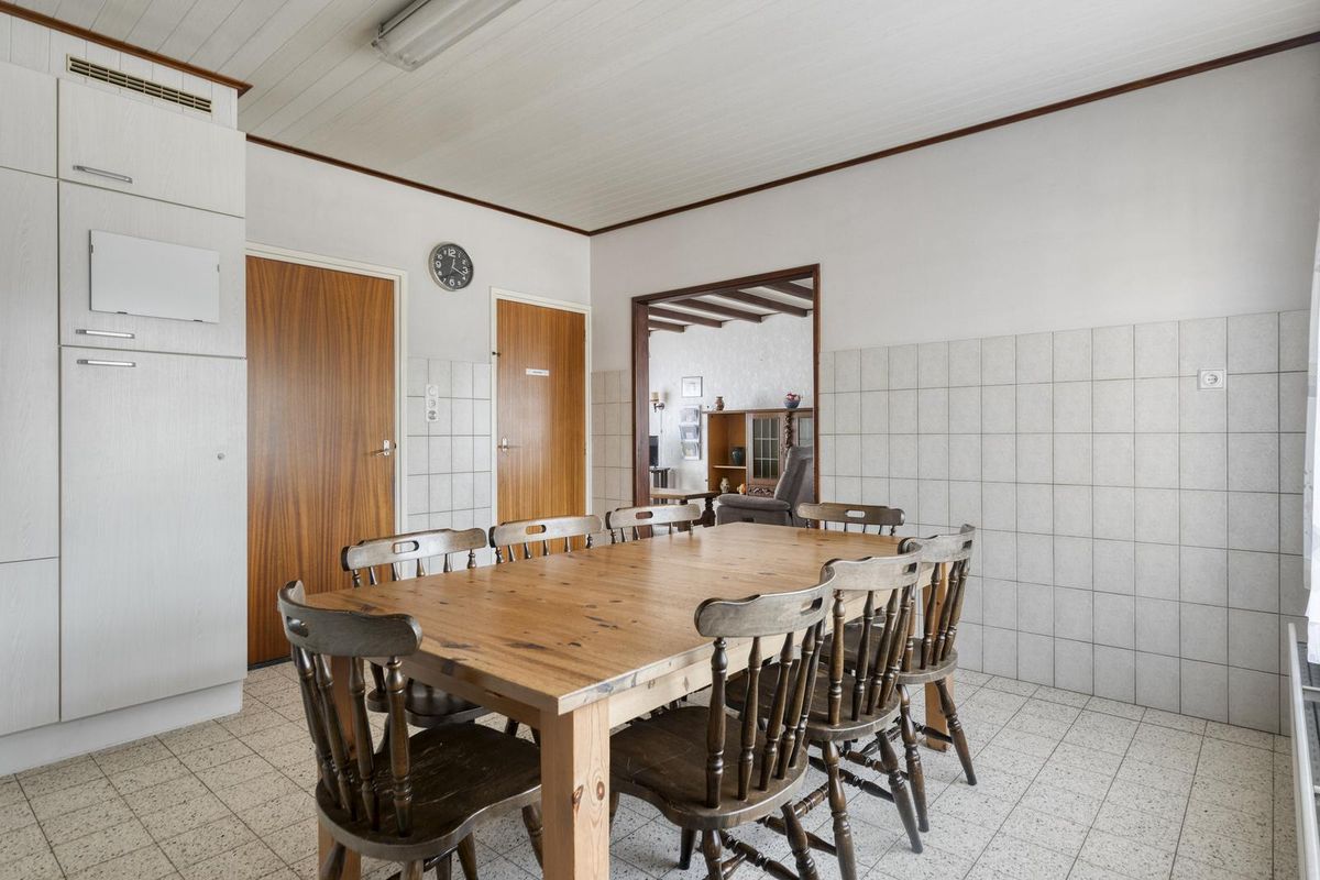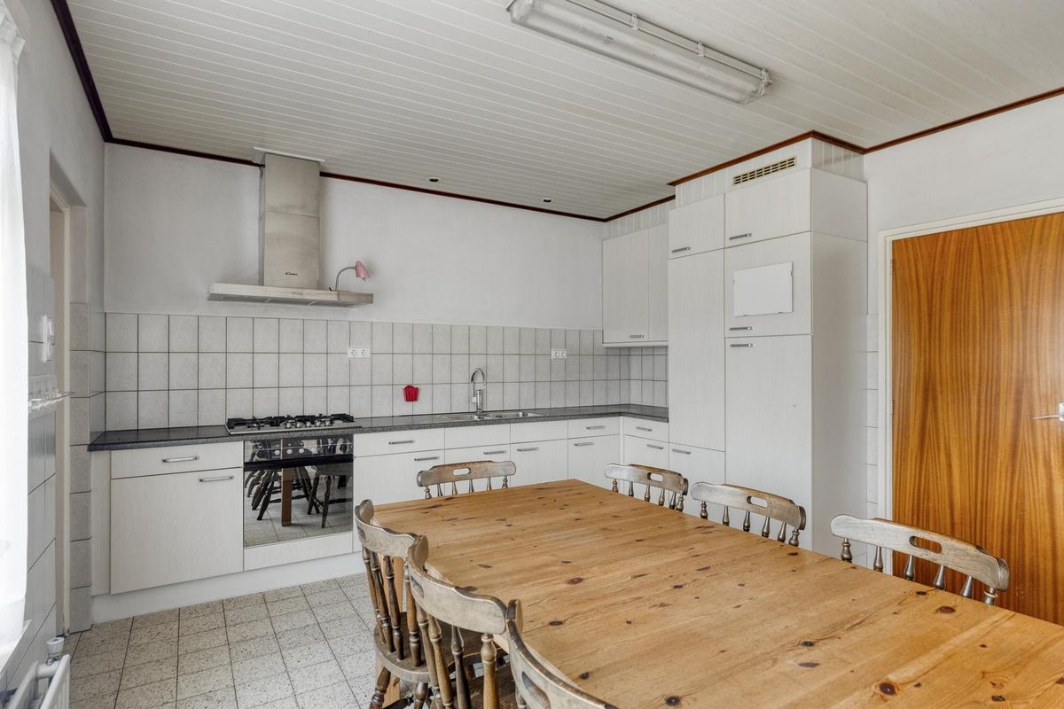 De keuken is eenvoudig maar groot van opzet en uitgerust met een 5-pits gasfornuis, koelkast en oven. Vanuit hier bereik je de kelder: droog, ruim en ideaal voor voorraadopslag, met toegang tot de kruipruimte onder de gehele woning.