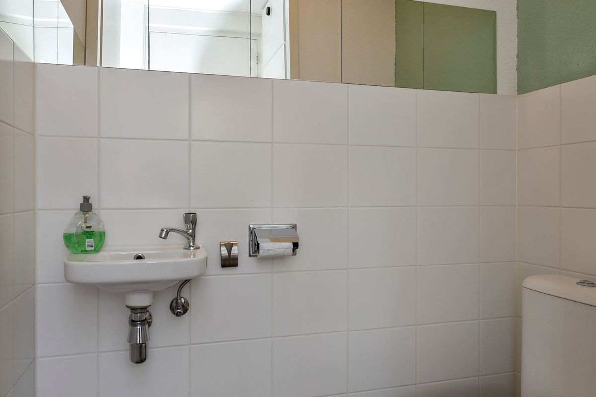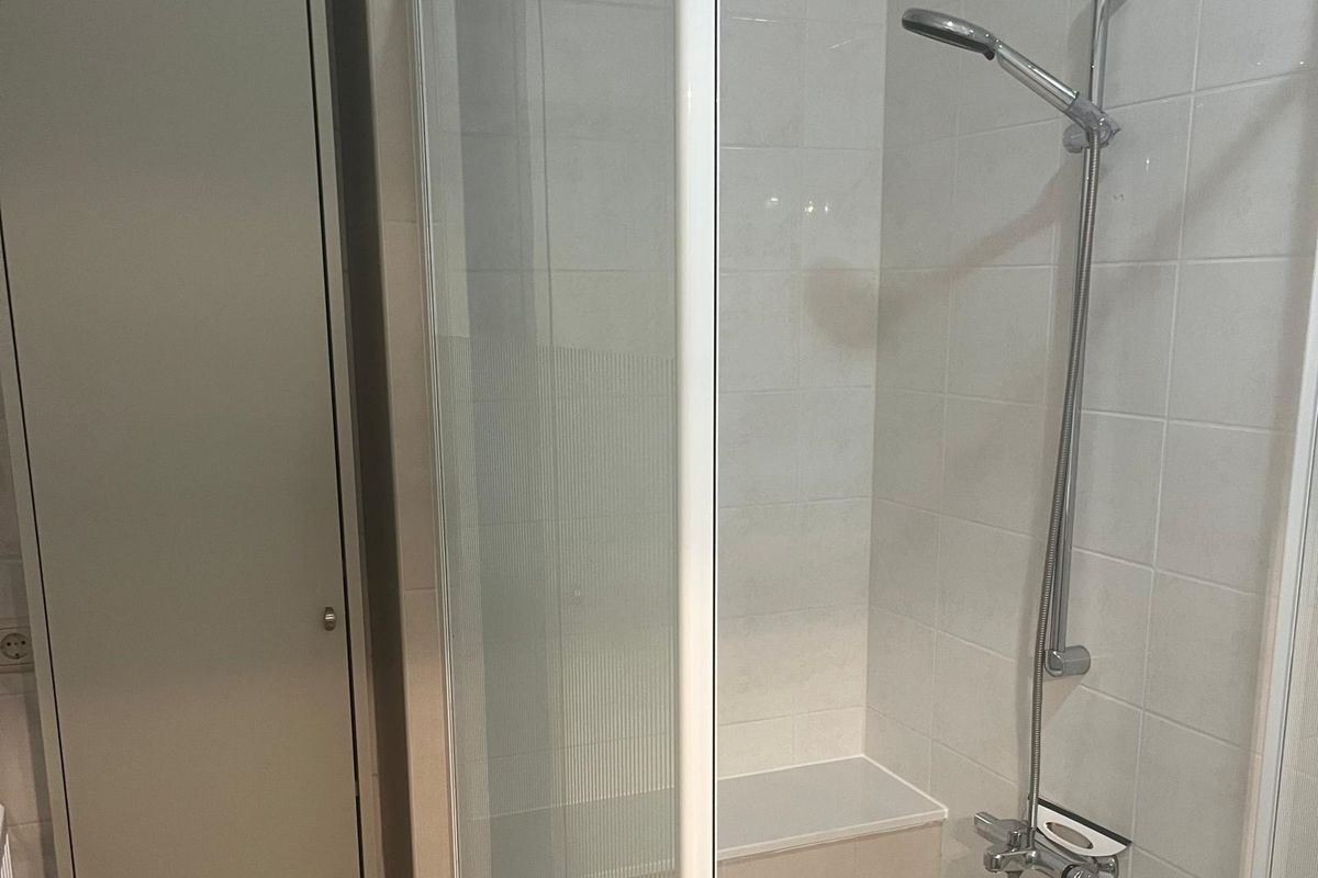 De volledig betegelde badkamer is modern afgewerkt en voorzien van vloerverwarming. U vindt hier een douchecabine, een toilet, een stijlvol wastafelmeubel en een extra kast voor het opbergen van handdoeken en toiletartikelen.