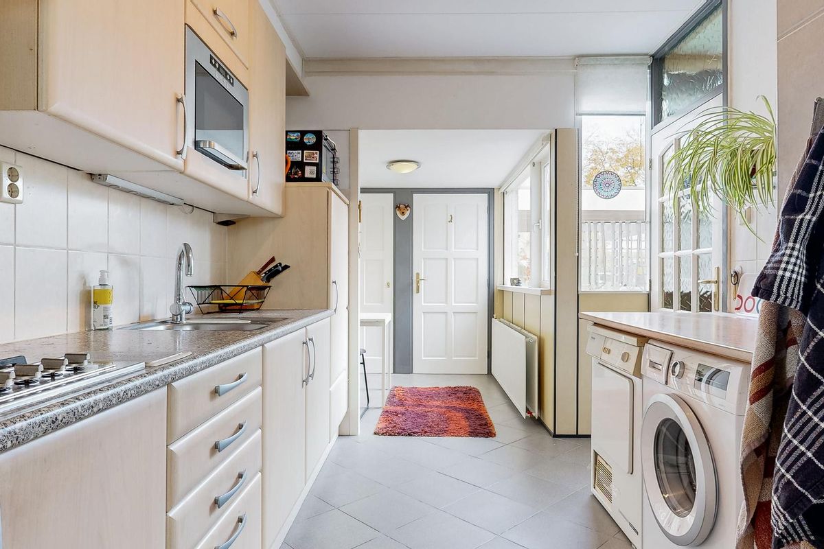 Zodra je de woonkamer binnenstapt, valt het licht direct op. De brede raampartij en de aangrenzende serre zorgen niet alleen voor een fijne verbinding met de tuin, maar geven ook een prachtige doorkijk. De woonkamer voelt ruim en prettig aan dankzij de goede indeling, de houten vloer én het extra glas van de serre geeft nog meer lichtinval. Mede daardoor ook energiezuinig. De keuken ligt aan de voorzijde en kijkt uit over de voortuin met de fietsenberging en de straat. De keuken is neutraal van kleur en voorzien van diverse inbouwapparatuur, waaronder een gaskookplaat, een combimagnetron, een koelkast en de aansluitingen voor de (af)wasmachine en droger. Door de riante afmeting van de ruimte is er ook plek voor een knusse ontbijthoek, is er toegang tot het toilet én zijn er bovendien twee praktische bergkasten. In de centrale hal is zowel een toegangsdeur naar de woonkamer als naar de keuken en de trapopgang naar boven. De achtertuin ligt gunstig op de zon en heeft achterin een sfeervolle atelierruimte met een berging en een achterom.