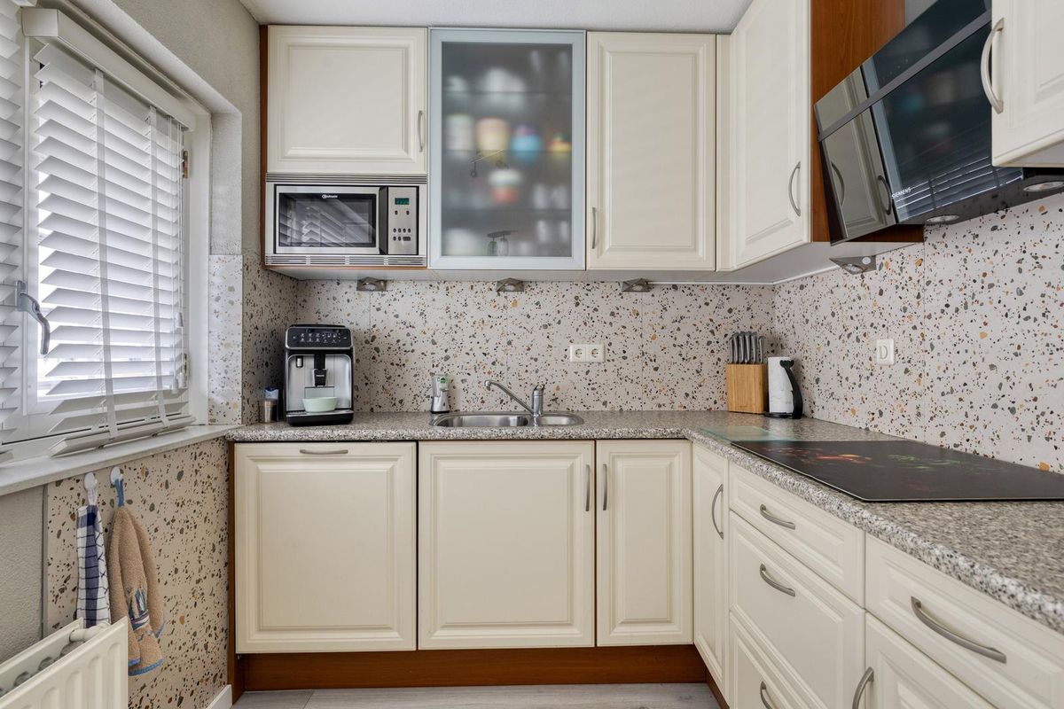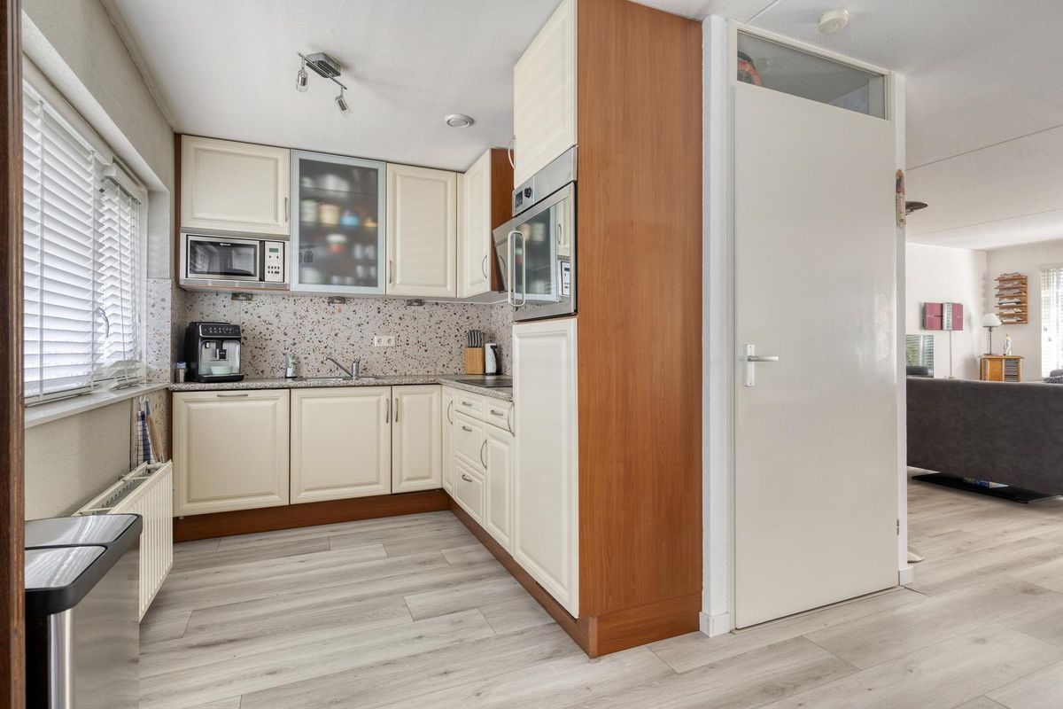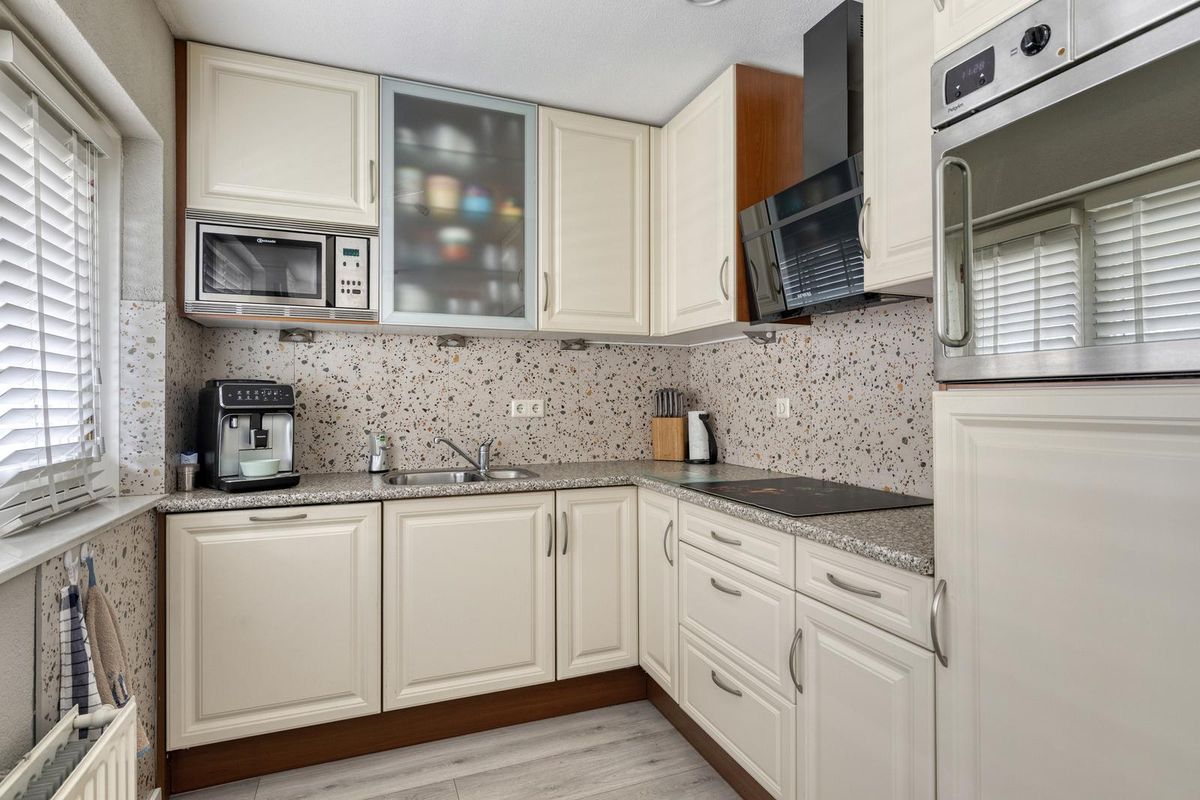 De keuken is in een hoekopstelling geplaatst en voorzien van diverse inbouwapparatuur, waaronder een kookplaat met afzuigkap, oven, magnetron en een koelkast. Tevens is er voldoende kastruimte aanwezig.