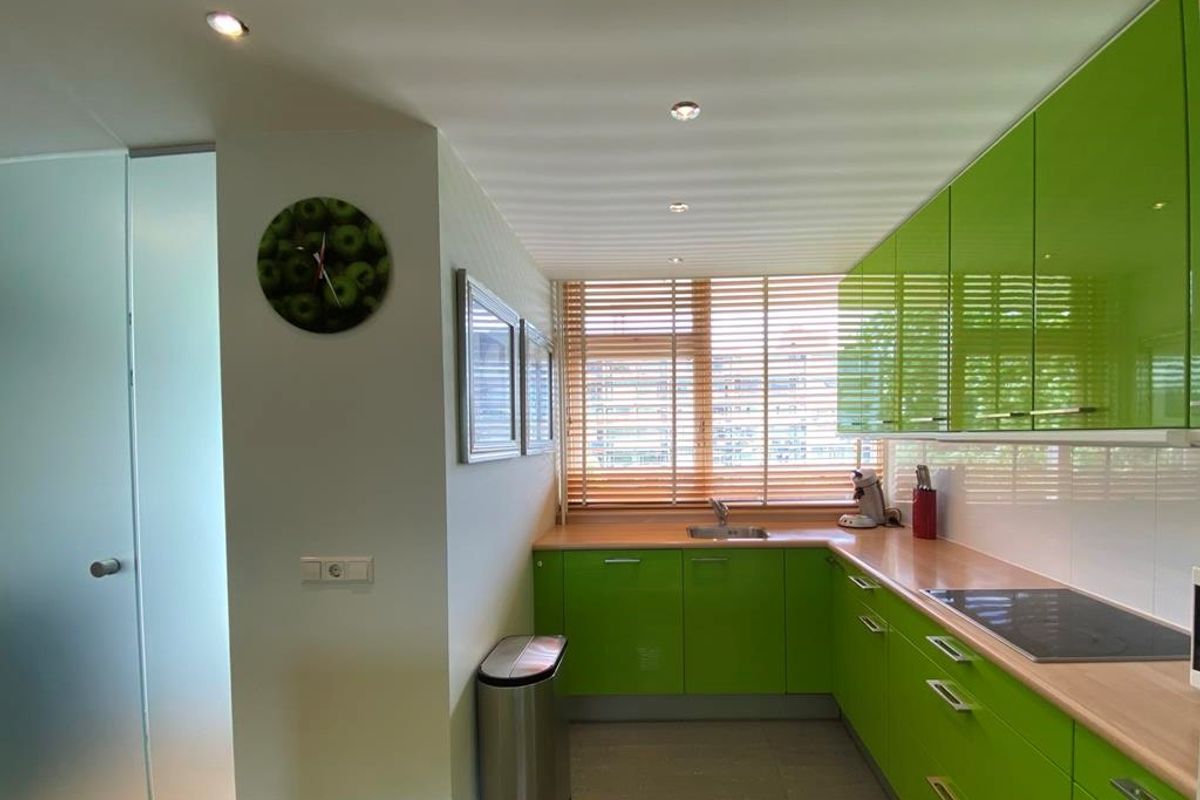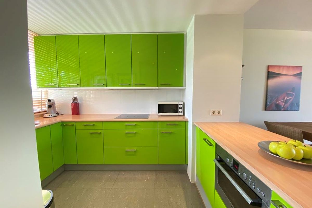 Kitchen: The open plan, U- shaped, kitchen is an eye catcher due to the modern apple green cabinets. The kitchen is equipped with all modern appliances and is situated on the front of the flat.