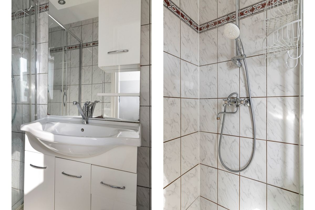 De keuken is praktisch ingedeeld in een rechte opstelling en uitgerust met diverse inbouwapparatuur, waaronder een inductiekookplaat, afzuigkap, oven en koel-vriescombinatie. Vanuit de keuken is er toegang tot de badkamer met douche, wastafel en aansluiting voor de wasmachine.