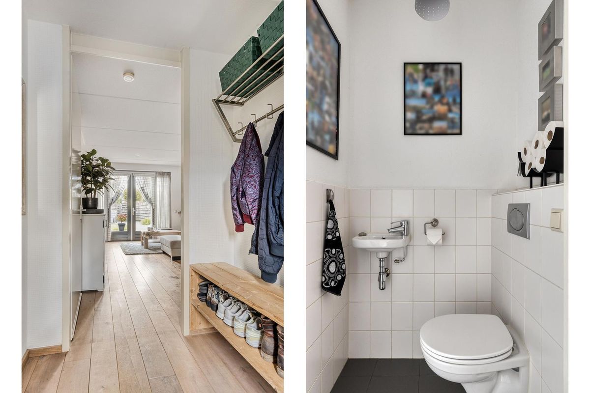 Via de entree met meterkast en toilet betreedt u de sfeervolle woonkamer. Dankzij de grote ramen is deze ruimte licht en uitnodigend, met aan de achterzijde de gezellige zithoek die uitkijkt op de tuin. Op zonnige dagen zet u eenvoudig de tuindeuren open, waardoor binnen en buiten moeiteloos in elkaar overlopen – perfect voor lange zomeravonden of gezellige borrels met vrienden. De eethoek bevindt zich centraal in de woonkamer en vormt het verbindende hart van het huis. Hier dineert u met het gezin, werkt u rustig aan de keukentafel of geniet u van een goed glas wijn terwijl u uitkijkt op de tuin.