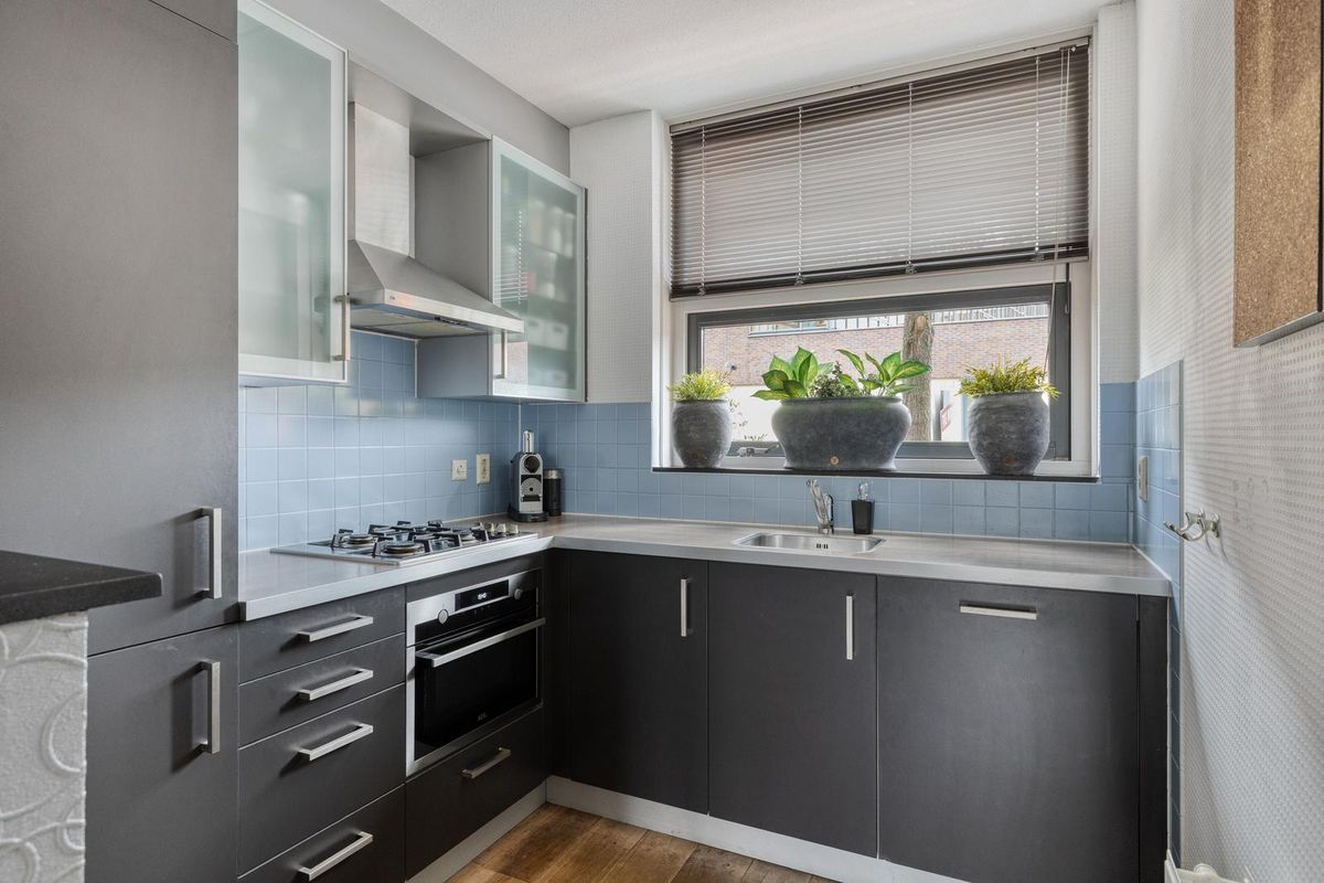 De moderne, L-vormige keuken in stijlvolle grijstinten is praktisch ingericht en voorzien van alle benodigde inbouwapparatuur: een gaskookplaat, afzuigkap, combi-oven, koel-vriescombinatie en vaatwasser. Onder de trap bevindt zich een handige bergkast met extra opbergruimte én de cv-installatie (Intergas, 2022).