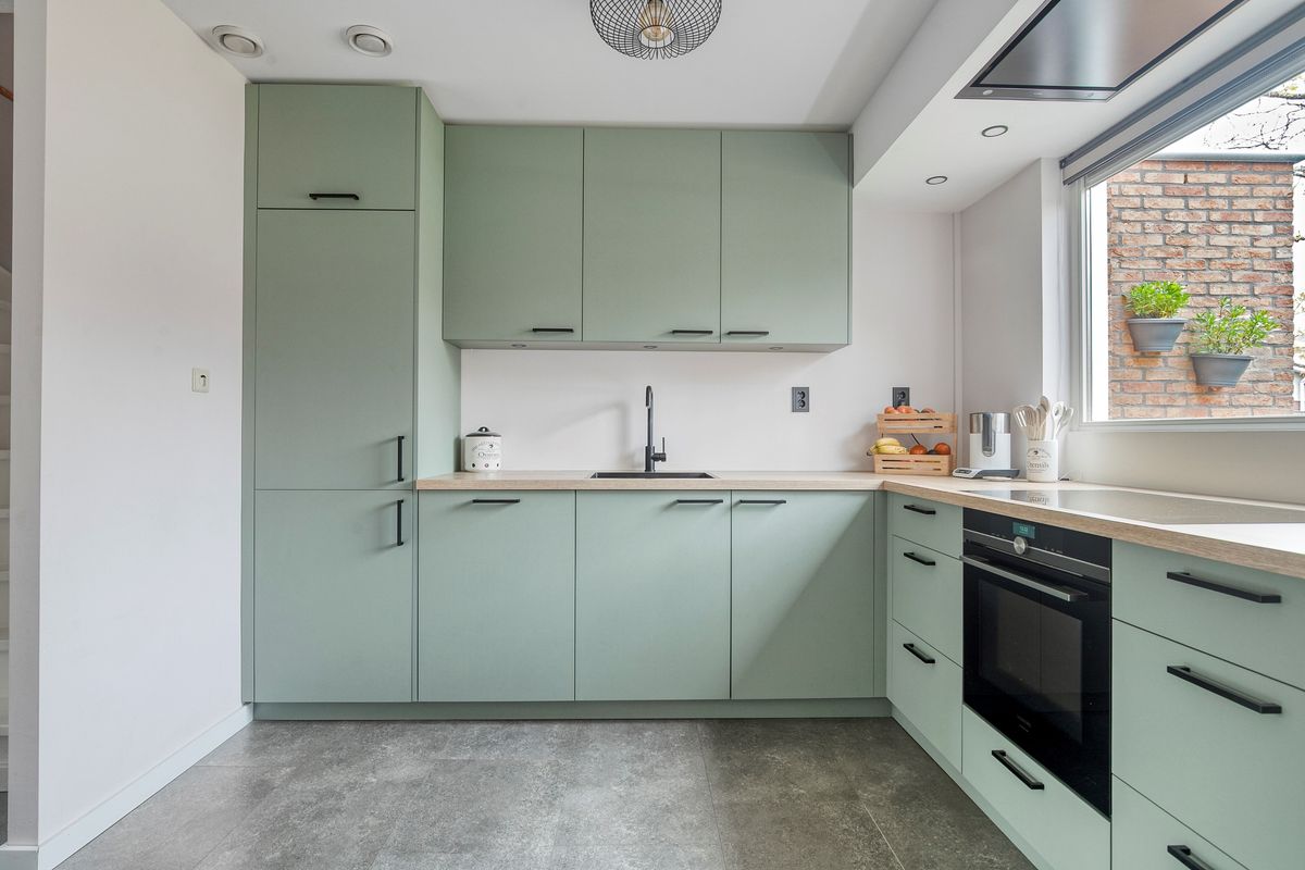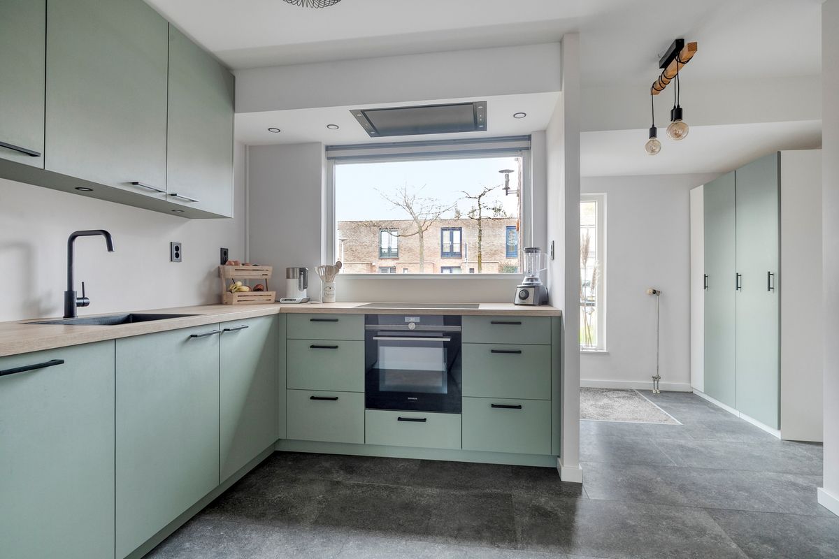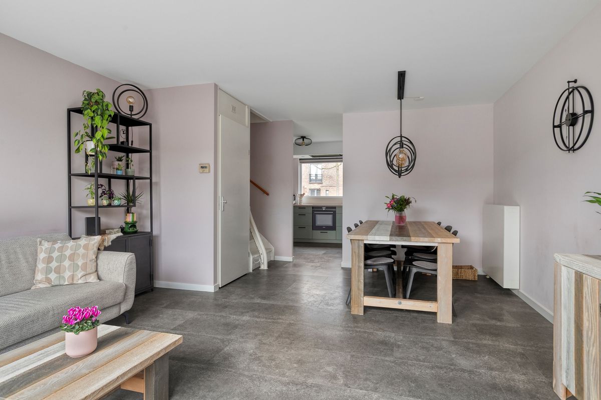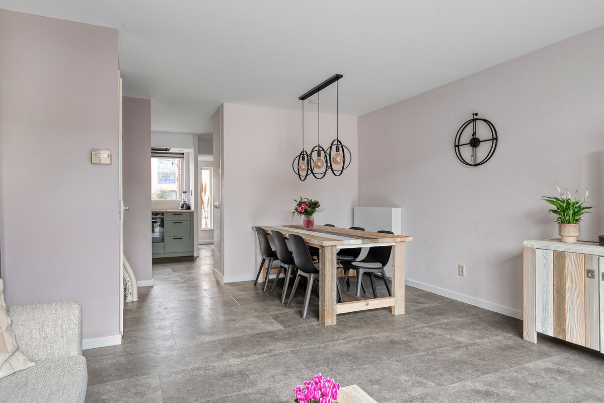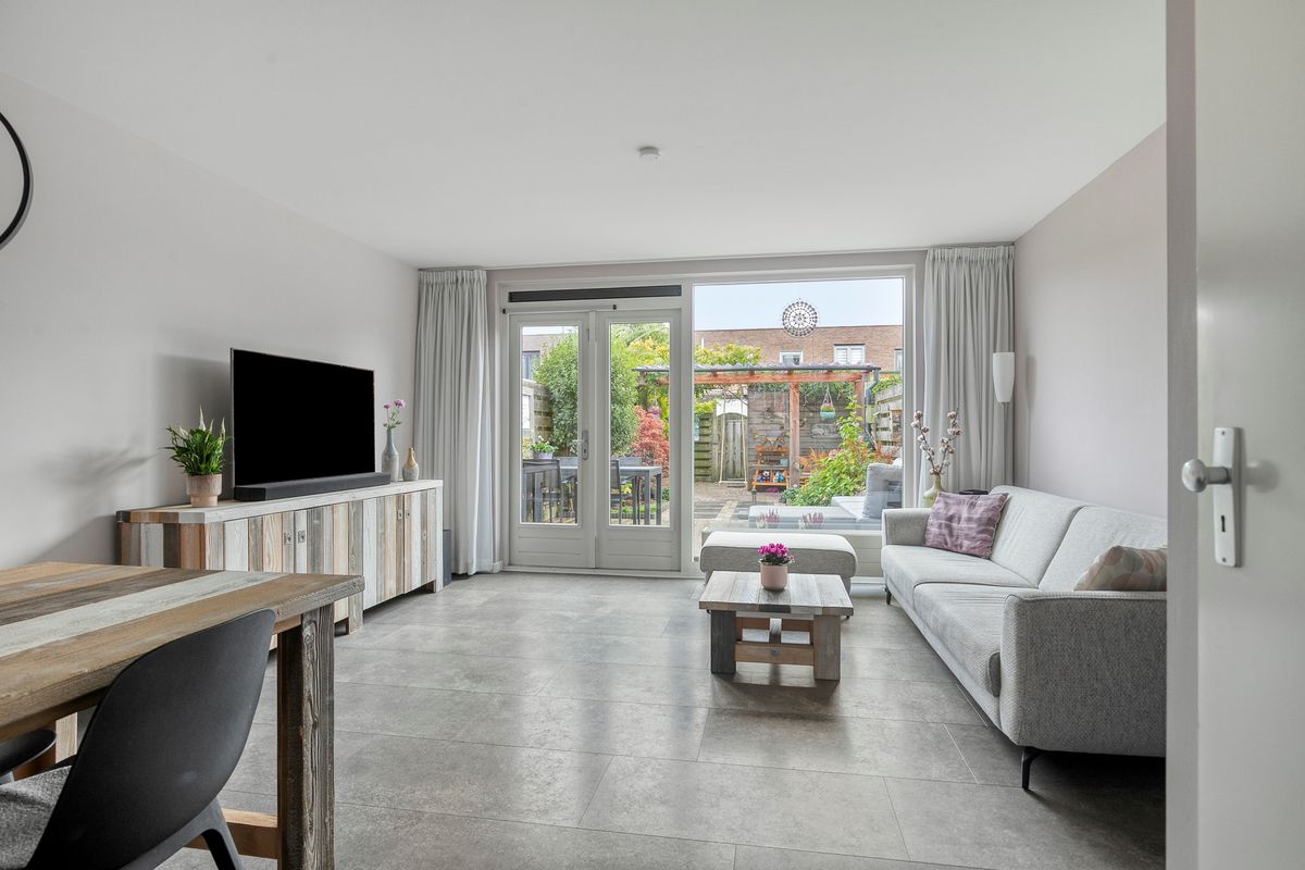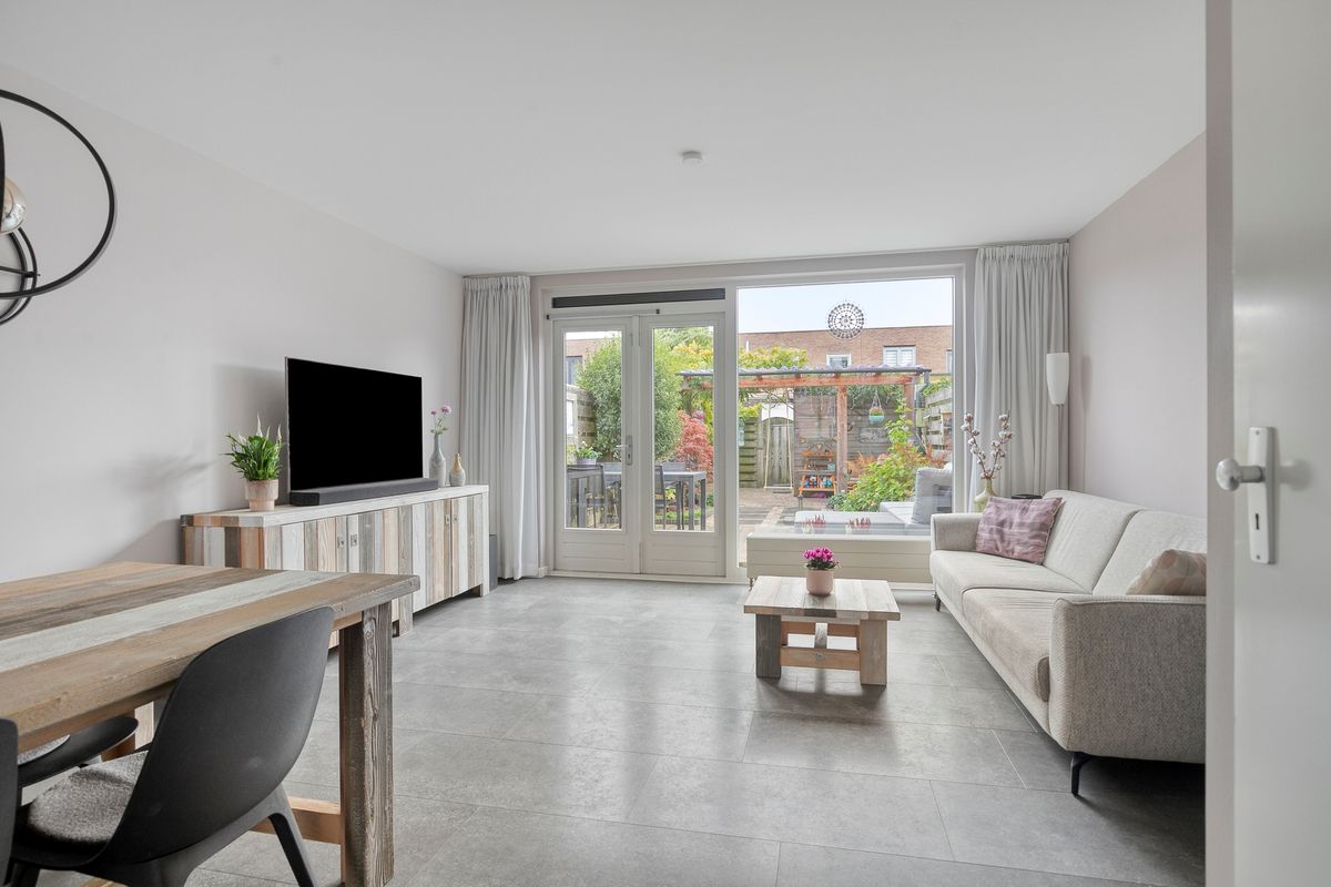 Bij binnenkomst betreedt u eerst de entreehal met meterkast en toiletruimte, waarna u de open keuken binnenstapt. De keuken, volledig vernieuwd in 2021, is uitgevoerd in een stijlvolle hoekopstelling met hoogwaardige inbouwapparatuur, soft close kastjes, een Le Mans-hoekkast, een ruim werkblad en een brede spoelbak. Vanuit de keuken loopt u door naar de woonkamer, licht en ruim dankzij de openslaande deuren naar de achtertuin, waardoor binnen en buiten naadloos in elkaar overlopen. De PVC-vloer en strak gestucte wanden maken het geheel modern en uitnodigend.