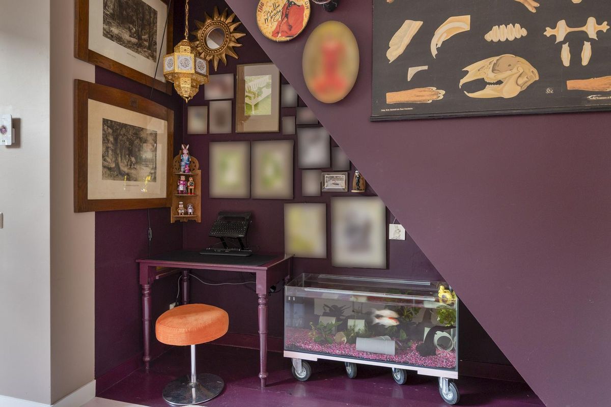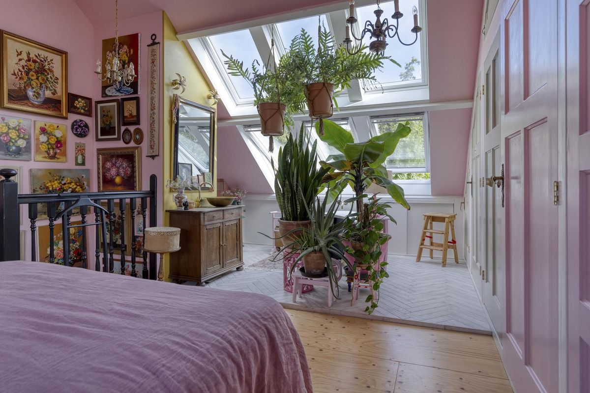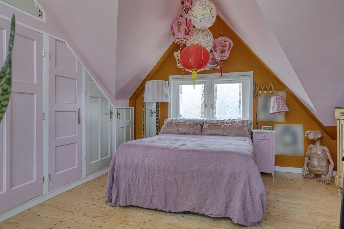 Via de vaste originele trap bereikt u de eerste verdieping, waar u een royale slaapkamer aantreft. Deze kamer is voorzien van een op maat gemaakte kastenwand met oude paneeldeuren, waardoor een perfecte combinatie van opbergruimte en stijl ontstaat. De hoogte geeft de kamer een ruimtelijk en luxe gevoel. De badkamer op deze verdieping is een echte blikvanger, ontworpen om licht en ruimte optimaal te benutten. Met maar liefst zes Velux dakramen valt het daglicht prachtig naar binnen, waardoor een luchtige en serene sfeer ontstaat. De badkamer is voorzien van vloerverwarming en diverse sanitair, waaronder een vrijstaand ligbad op pootjes, een karakteristiek wastafelmeubel, een toilet en een ruime inloopdouche. Het geheel straalt comfort en stijl uit, ideaal voor ontspannen momenten na een drukke dag, kijkend vanuit het bad naar de lucht.