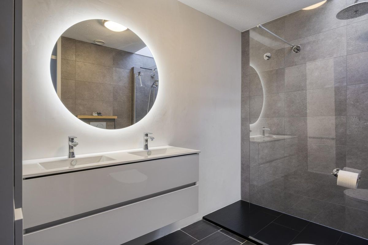 Via het statige trappenhuis met lichtkoepel bereik je de bovenste verdieping. De overloop geeft toegang tot twee goed bemeten slaapkamers, beide voorzien van een nette laminaatvloer en grote raampartijen. De moderne badkamer is geheel betegeld en uitgerust met douche, dubbele wastafel met meubel, toilet en spiegel met verlichting. Ook hier zorgt een lichtkoepel voor extra veel daglicht.