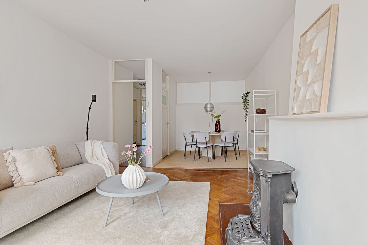 De royale woonkamer aan de voorzijde wordt direct gevuld met natuurlijk licht dankzij de grote raampartijen. Het uitzicht op het levendige straatbeeld van Amsterdam is een levend schilderij dat nooit verveelt. De living is ruim genoeg voor een comfortabele zithoek én een gezellige eethoek. Een charmante (sier)haard voegt karakter toe en versterkt de warme, huiselijke sfeer. Slim ingedeelde inbouwkasten bieden extra opbergruimte.