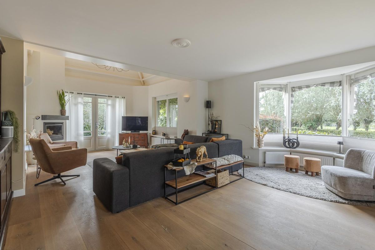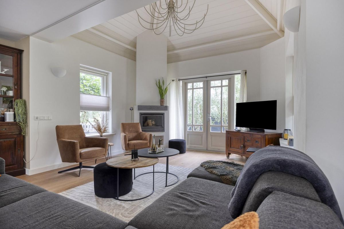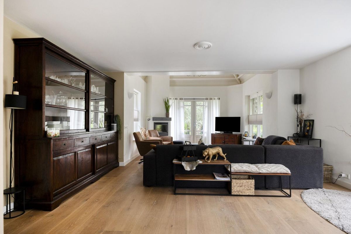 • Royale woonkamer met nokhoog plafond, brede eiken vloerdelen waaronder vloerverwarming, strakke schouw met houthaard en openslaande deuren naar de tuin.