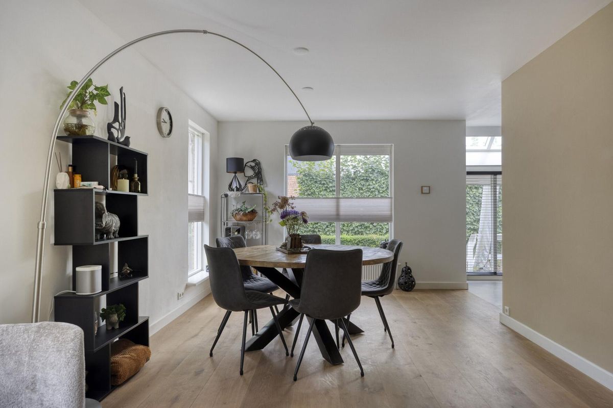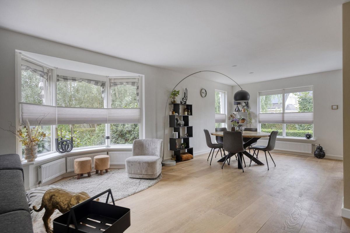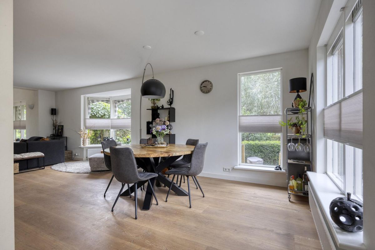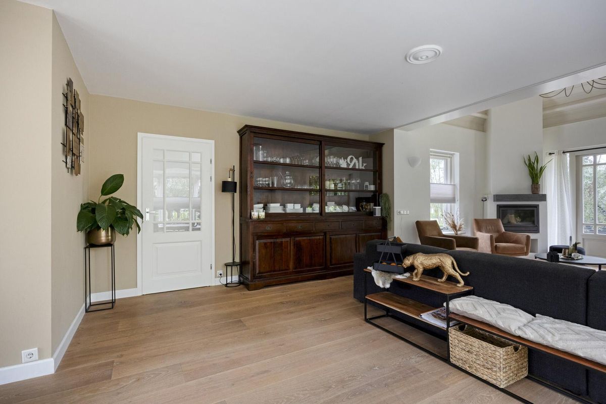 • Royale woonkamer met nokhoog plafond, brede eiken vloerdelen waaronder vloerverwarming, strakke schouw met houthaard en openslaande deuren naar de tuin.