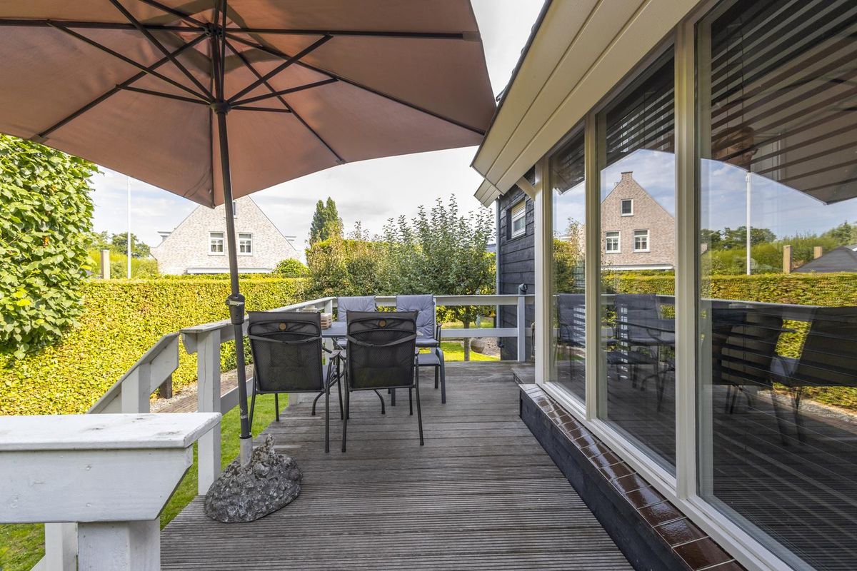 Buiten: Garage, houten overkapping/loungehoek met polderzicht, diverse zitplekken in zon en schaduw en praktische opslagruimte onder de woning.