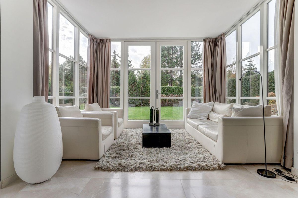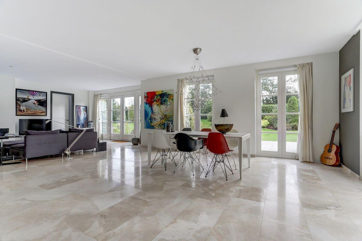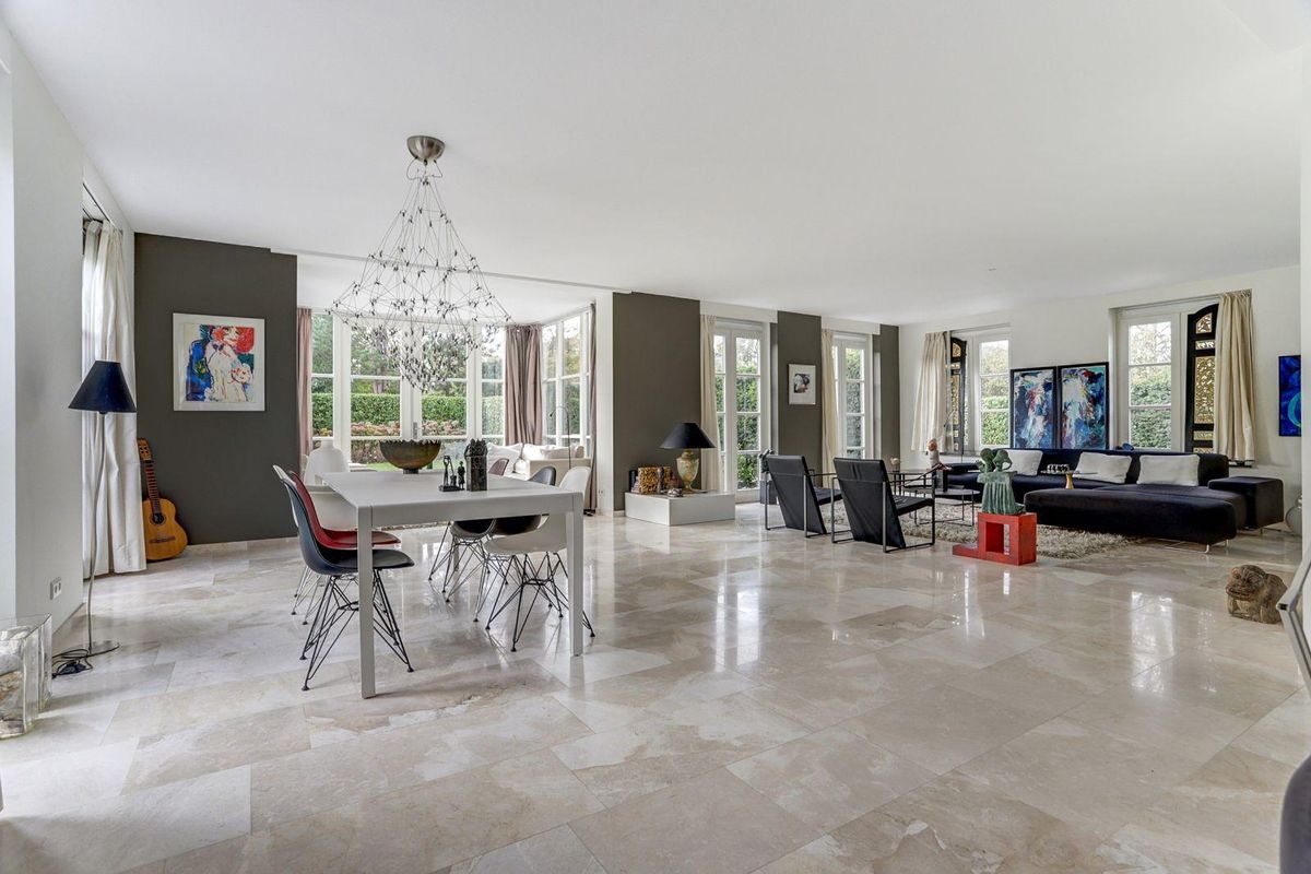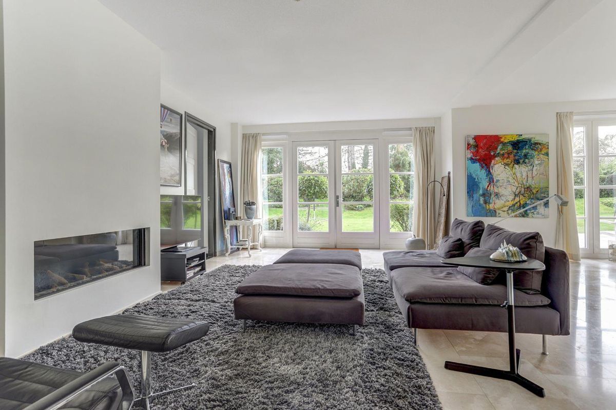 De lichte, ruim bemeten, L-vormige woonkamer met erker is afgewerkt met een marmeren vloer met vloerverwarming en een sfeervolle gashaard. Dankzij de grote raampartijen en de openslaande deuren naar de zonnige tuin geniet u hier van een prachtig gevoel van ruimte en licht, alsof u altijd buiten bent.