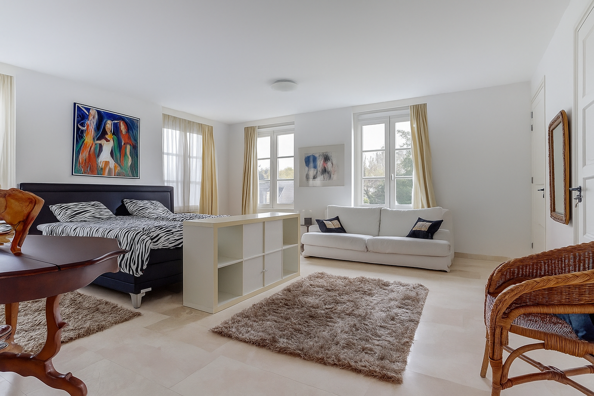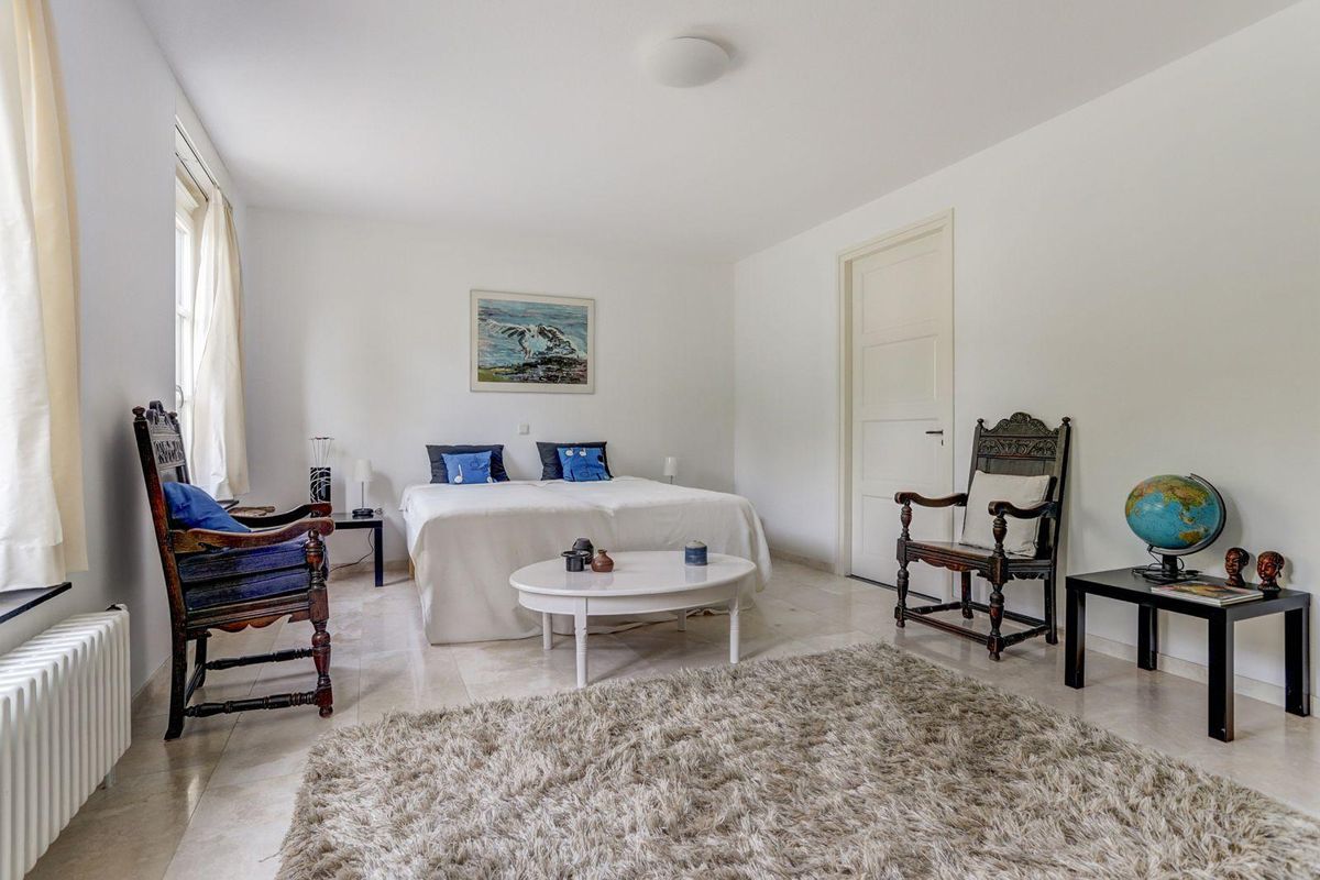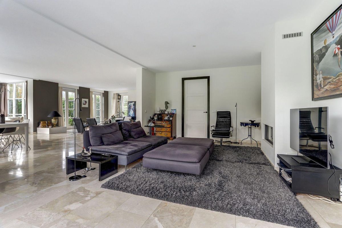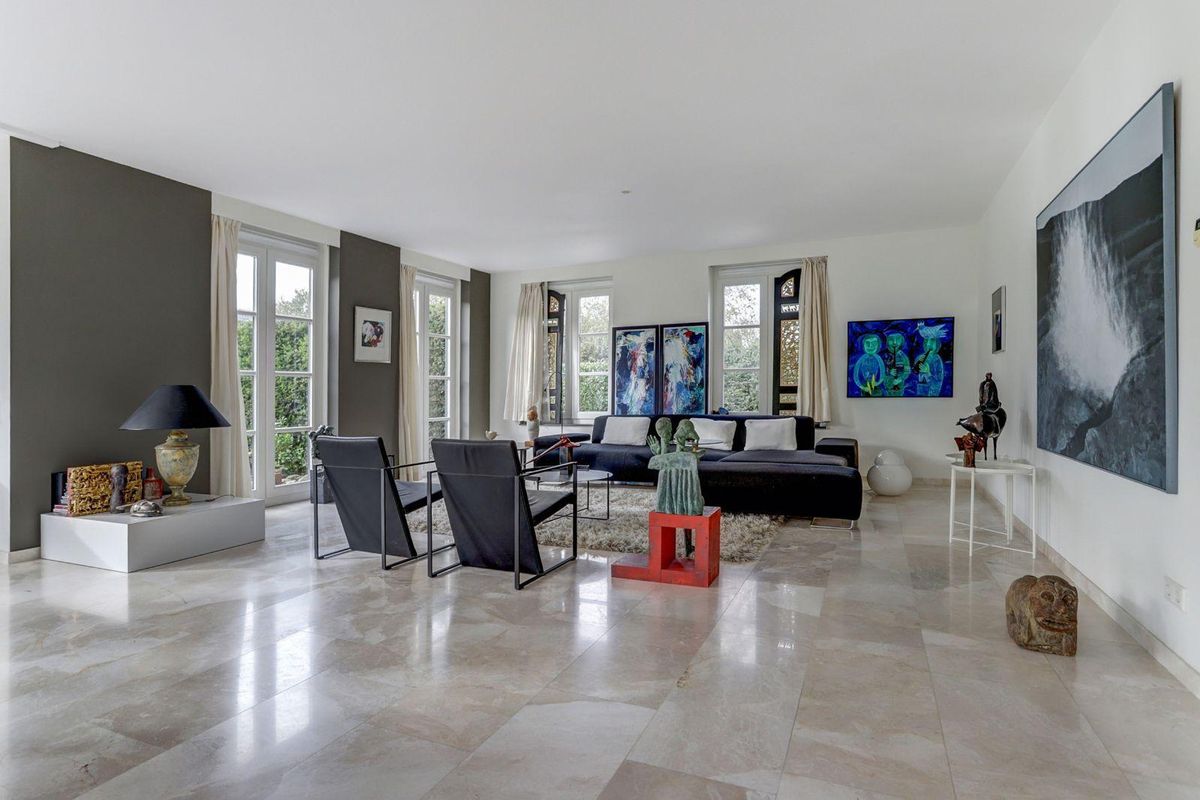 De lichte, ruim bemeten, L-vormige woonkamer met erker is afgewerkt met een marmeren vloer met vloerverwarming en een sfeervolle gashaard. Dankzij de grote raampartijen en de openslaande deuren naar de zonnige tuin geniet u hier van een prachtig gevoel van ruimte en licht, alsof u altijd buiten bent.