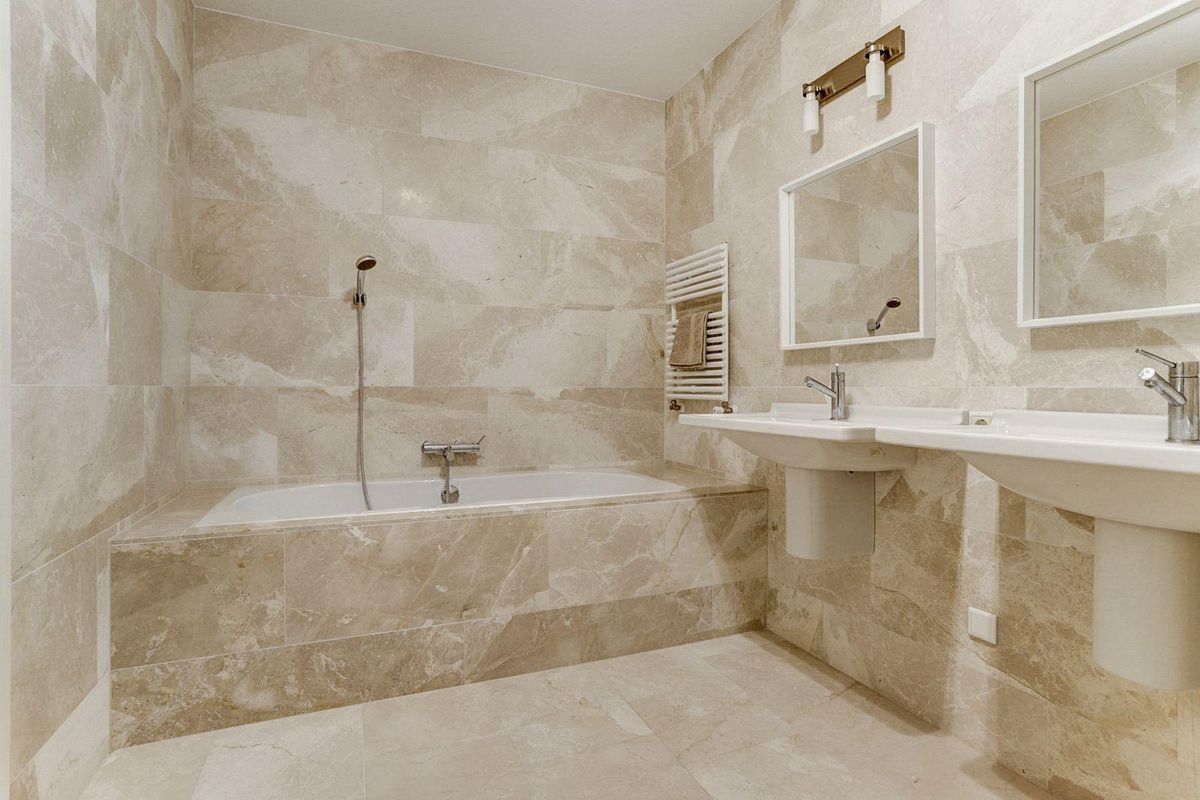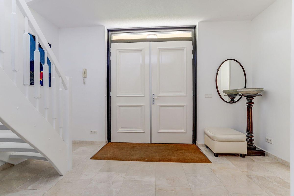 Via de statige dubbele voordeur betreedt u de indrukwekkende hal met een elegante trapopgang en gastentoilet. Vanuit de hal heeft u toegang tot de u de ruime slaapkamer op de begane grond voorzien van marmeren vloer, walk-in-closet en een ensuite badkamer met ligbad, douche, toilet en dubbele wastafel.