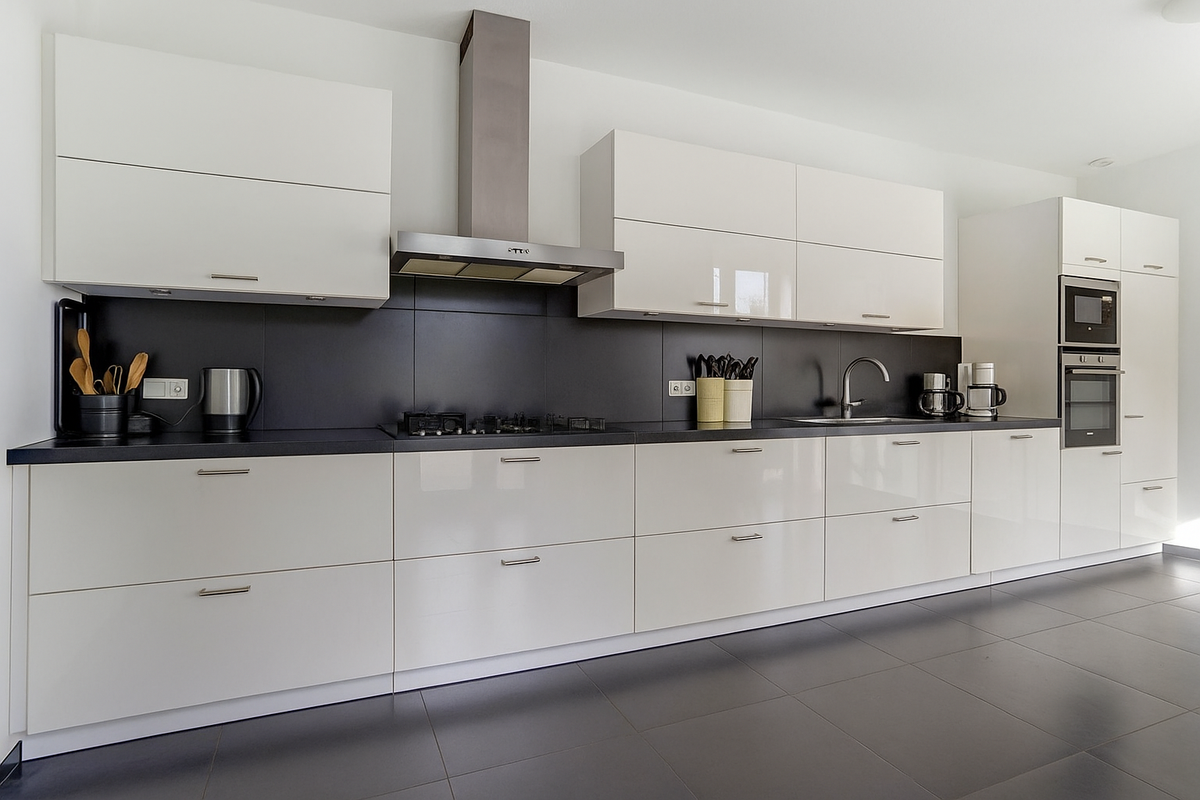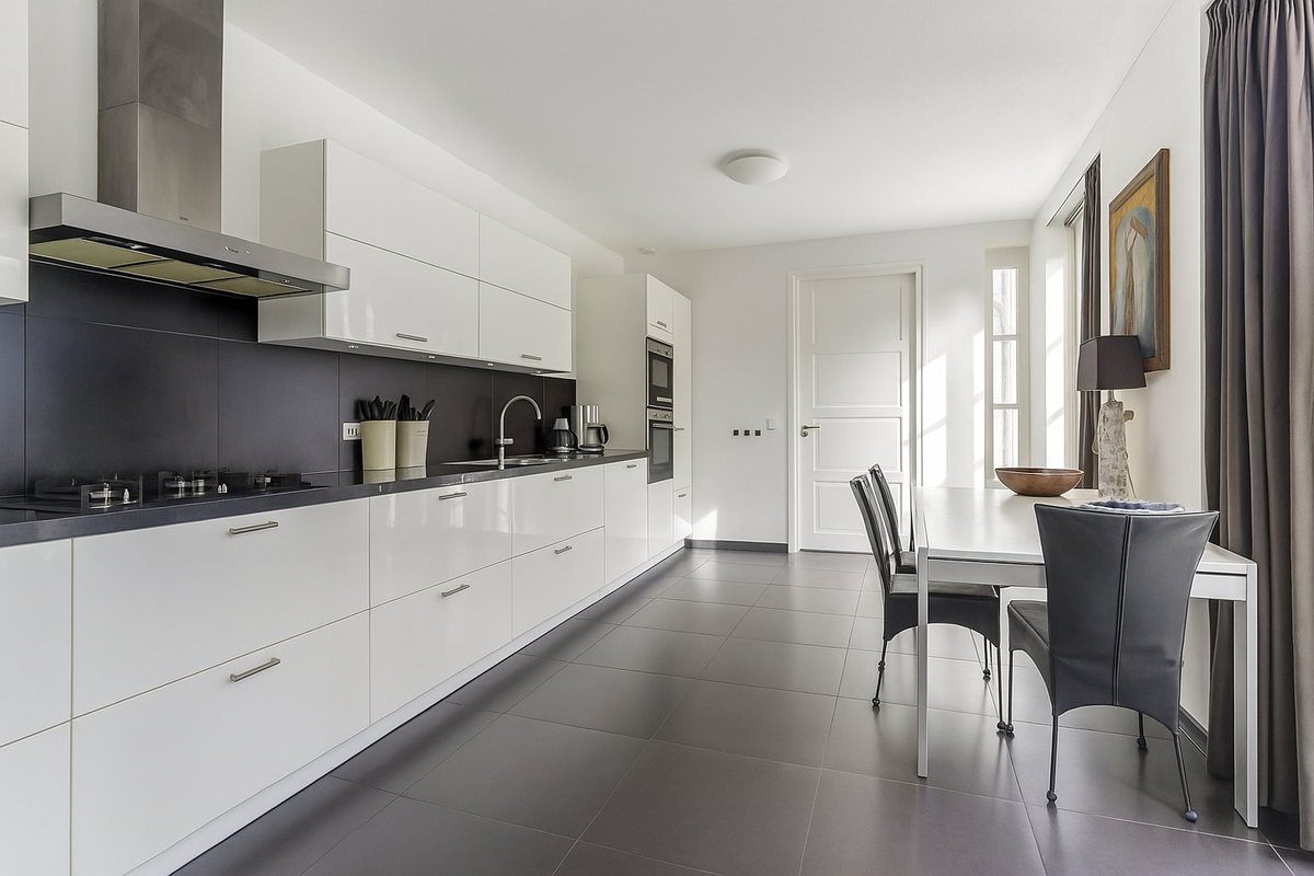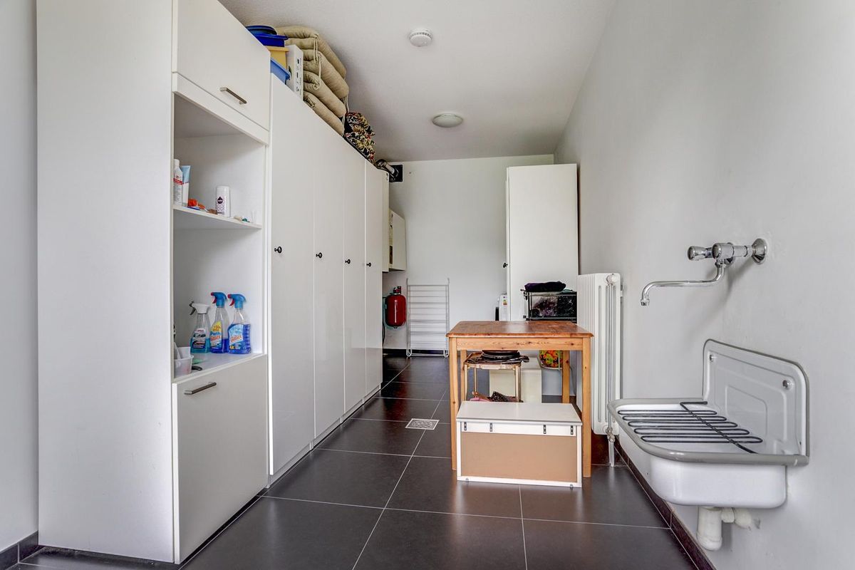 De moderne woonkeuken is van alle gemakken voorzien, waaronder een gaskookplaat, vaatwasser, magnetron, oven, koelkast en afzuigkap. Vanuit de keuken, woonkamer en bijkeuken heeft u toegang tot de tuin. Aangrenzend bevindt zich de bijkeuken met opstelplaats voor de Nefit CV-installatie, de boiler en de wasmachineaansluiting. De inpandige dubbele garage is eveneens vanuit de woning bereikbaar.