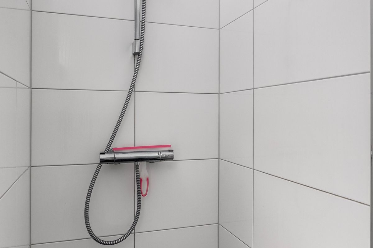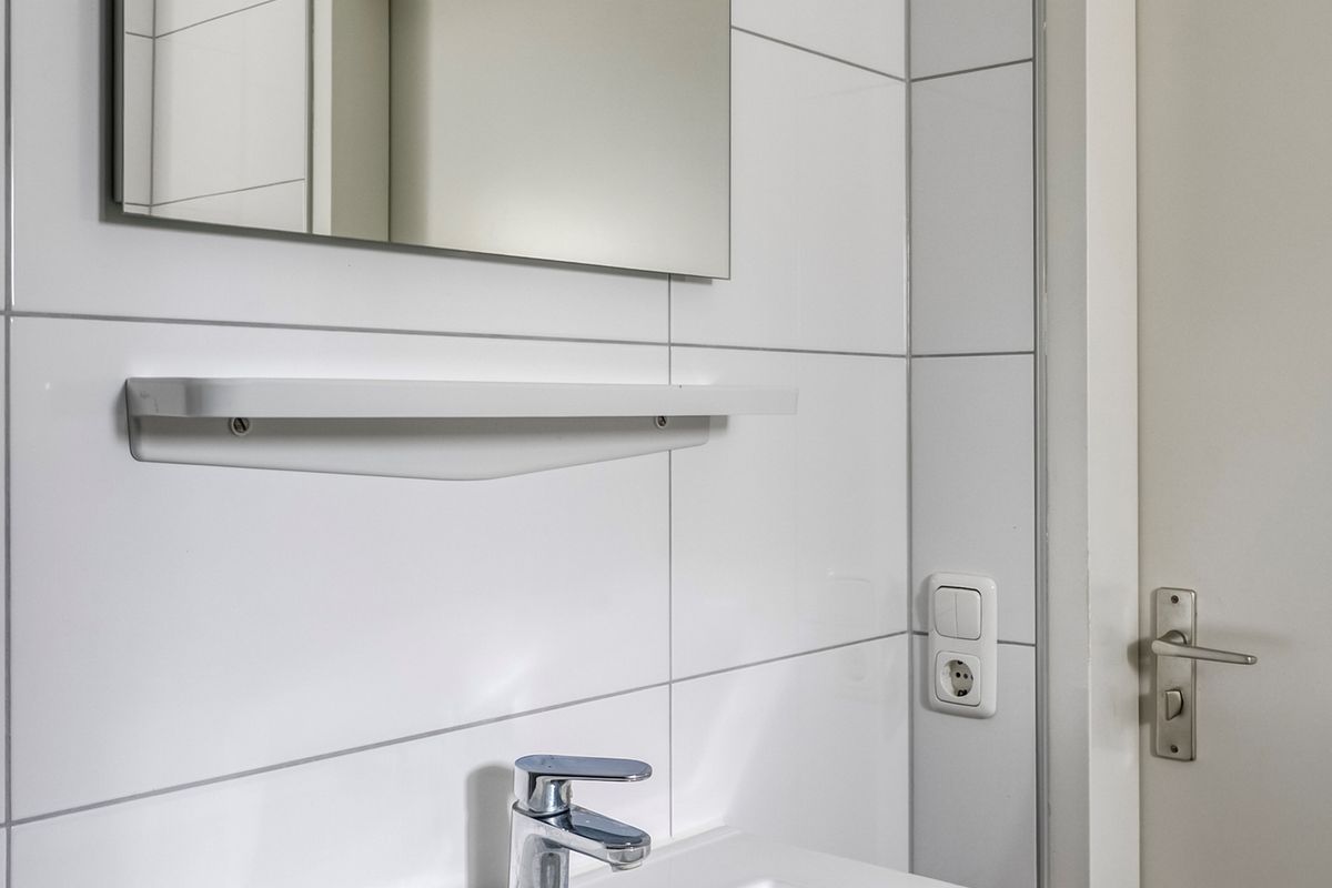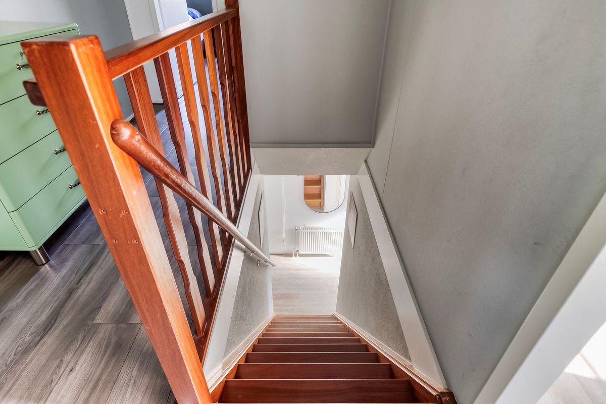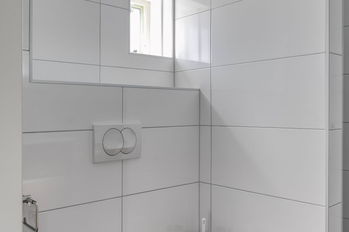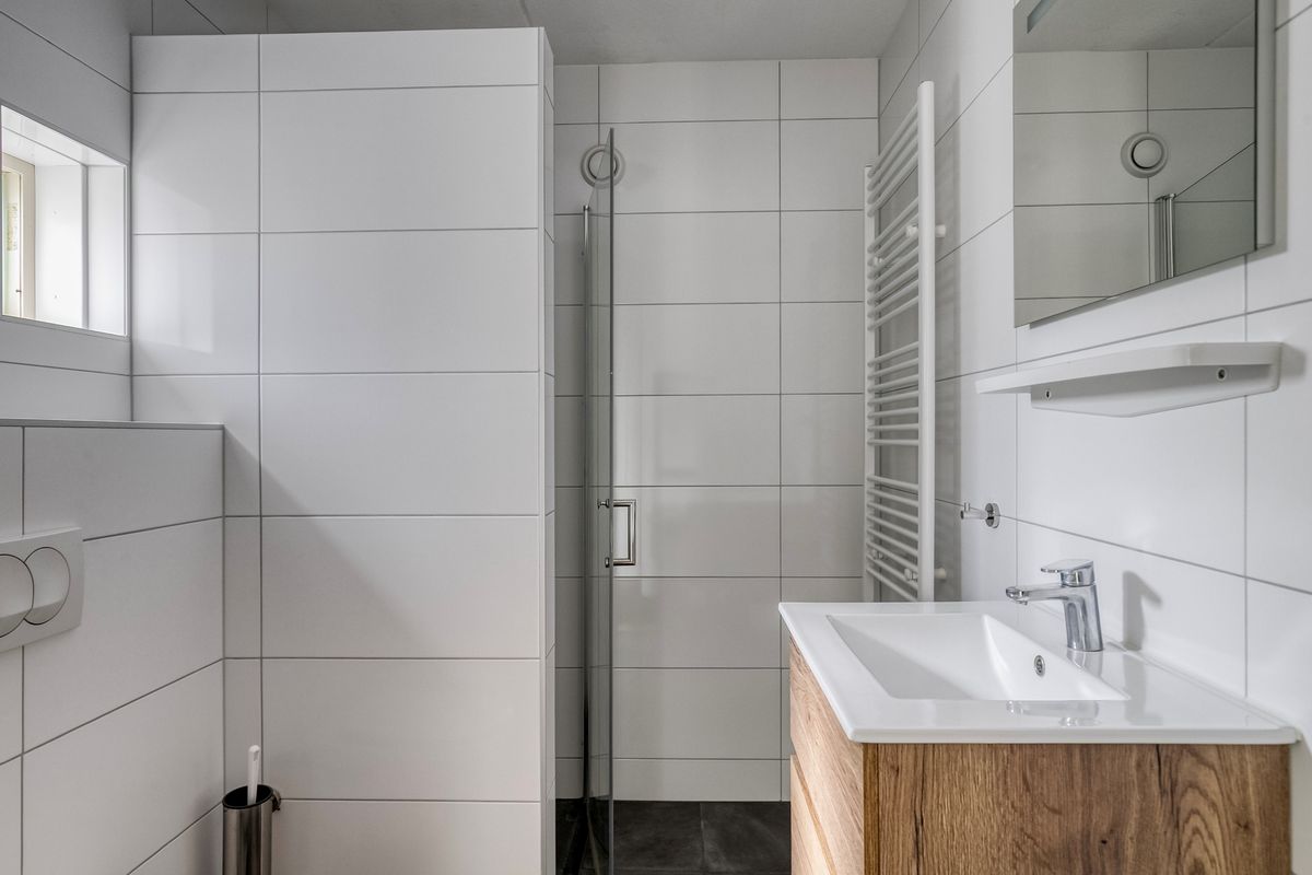 Overloop met bergruimte, 3 slaapkamers en de tweede moderne badkamer voorzien van een toilet, douchehoek en een wastafel.