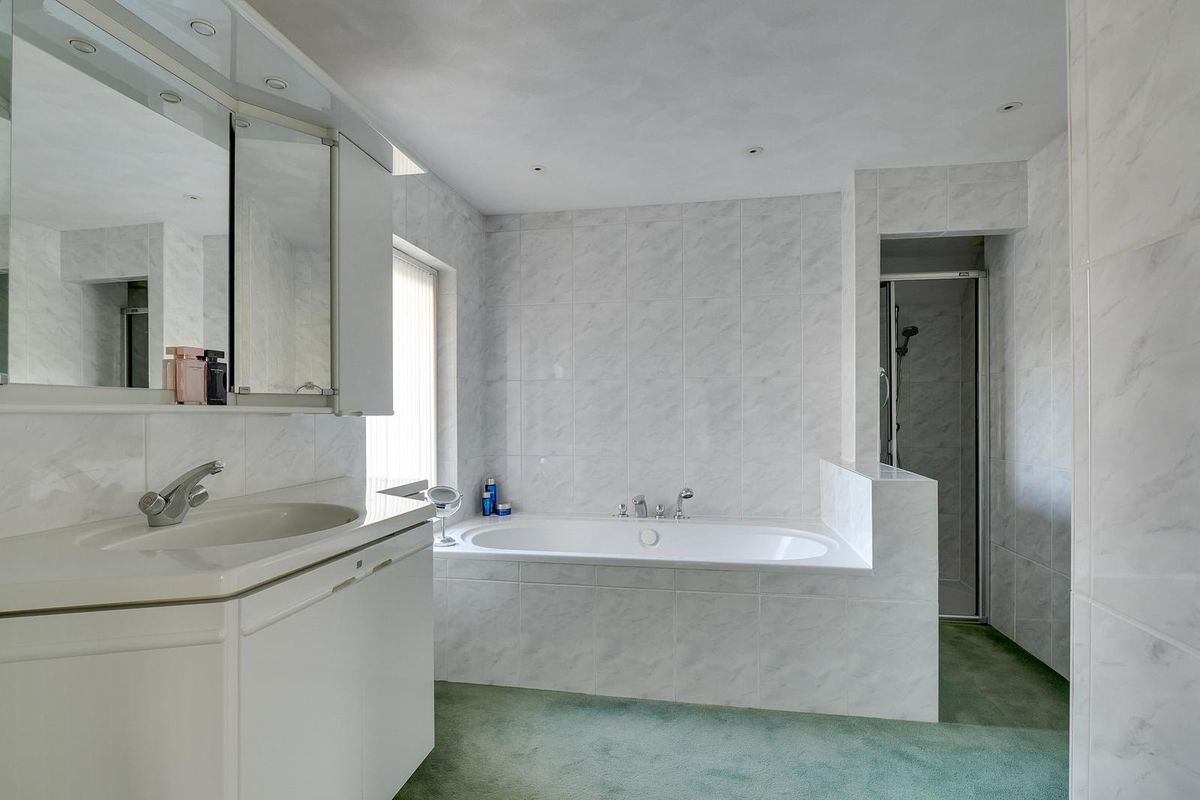 De eerste verdieping biedt drie slaapkamers, waarvan één momenteel is ingericht als royale kledingkamer. De badkamer is uitgerust met een ligbad, inloopdouche en wastafelmeubel. Ook is er een apart toilet op deze verdieping aanwezig.