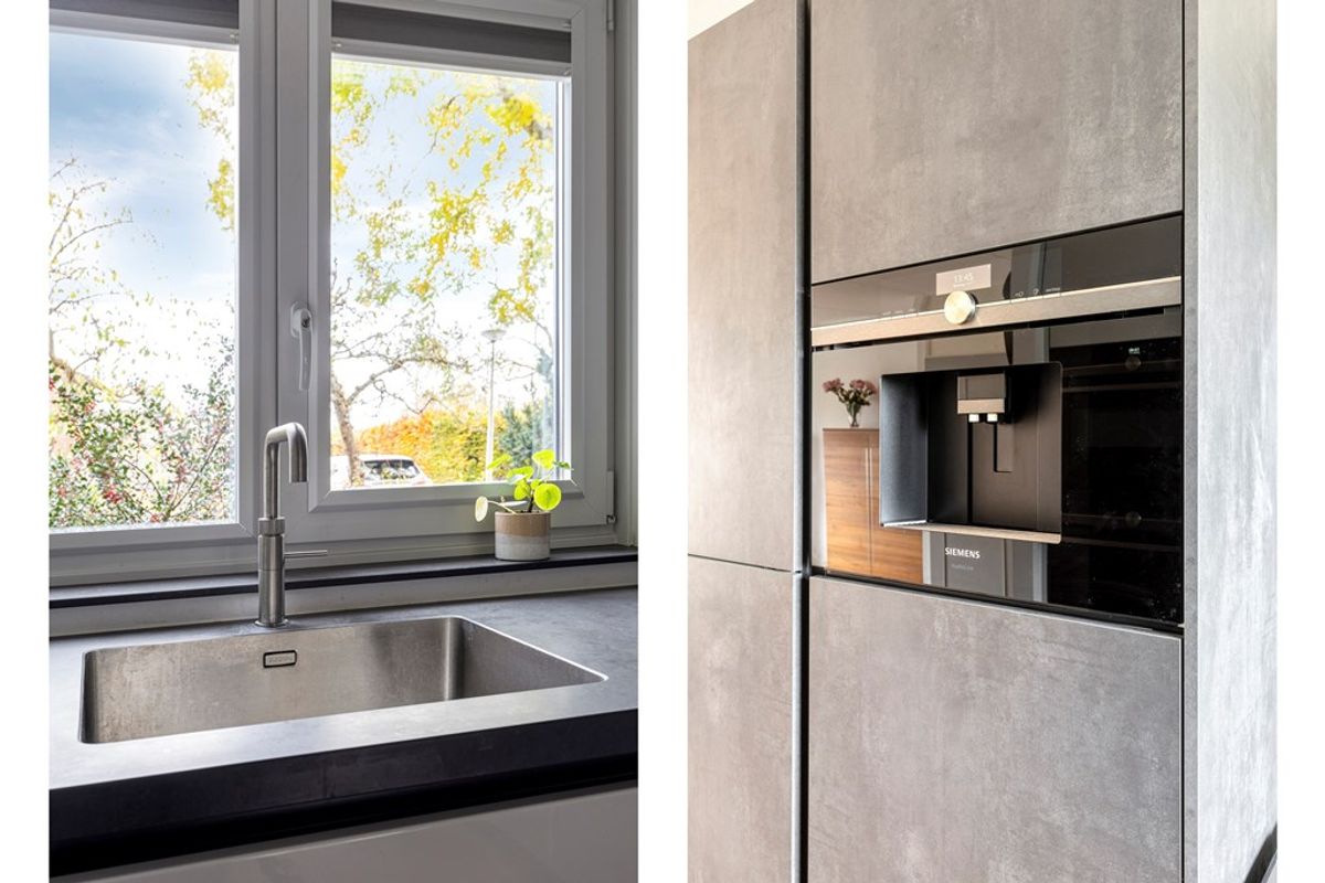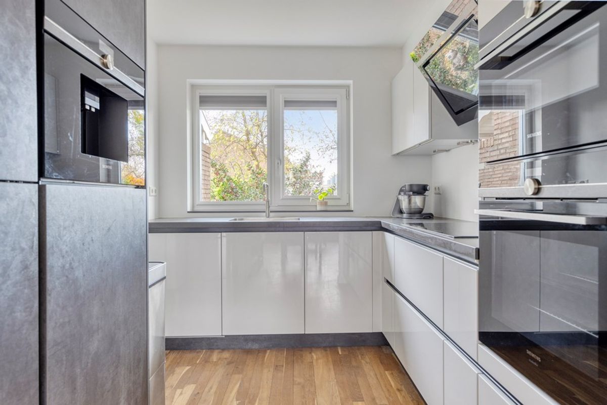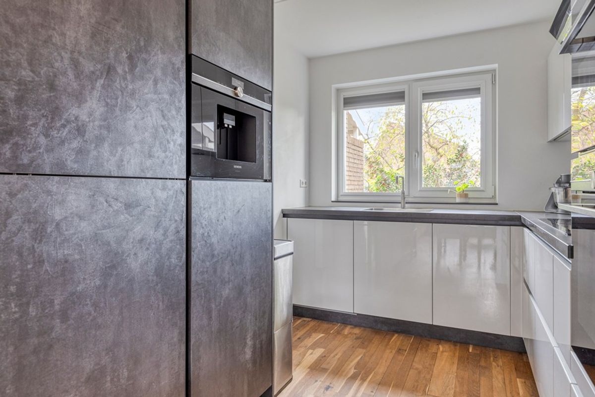 Aan de voorzijde bevindt zich de luxe, moderne hoekkeuken, compleet uitgerust met een koelkast, losse vriezer, geïntegreerd koffieapparaat, hetelucht- en combi-oven, inductiekookplaat, afzuigkap, vaatwasser en Quooker – alles in stijl en perfect afgewerkt.
