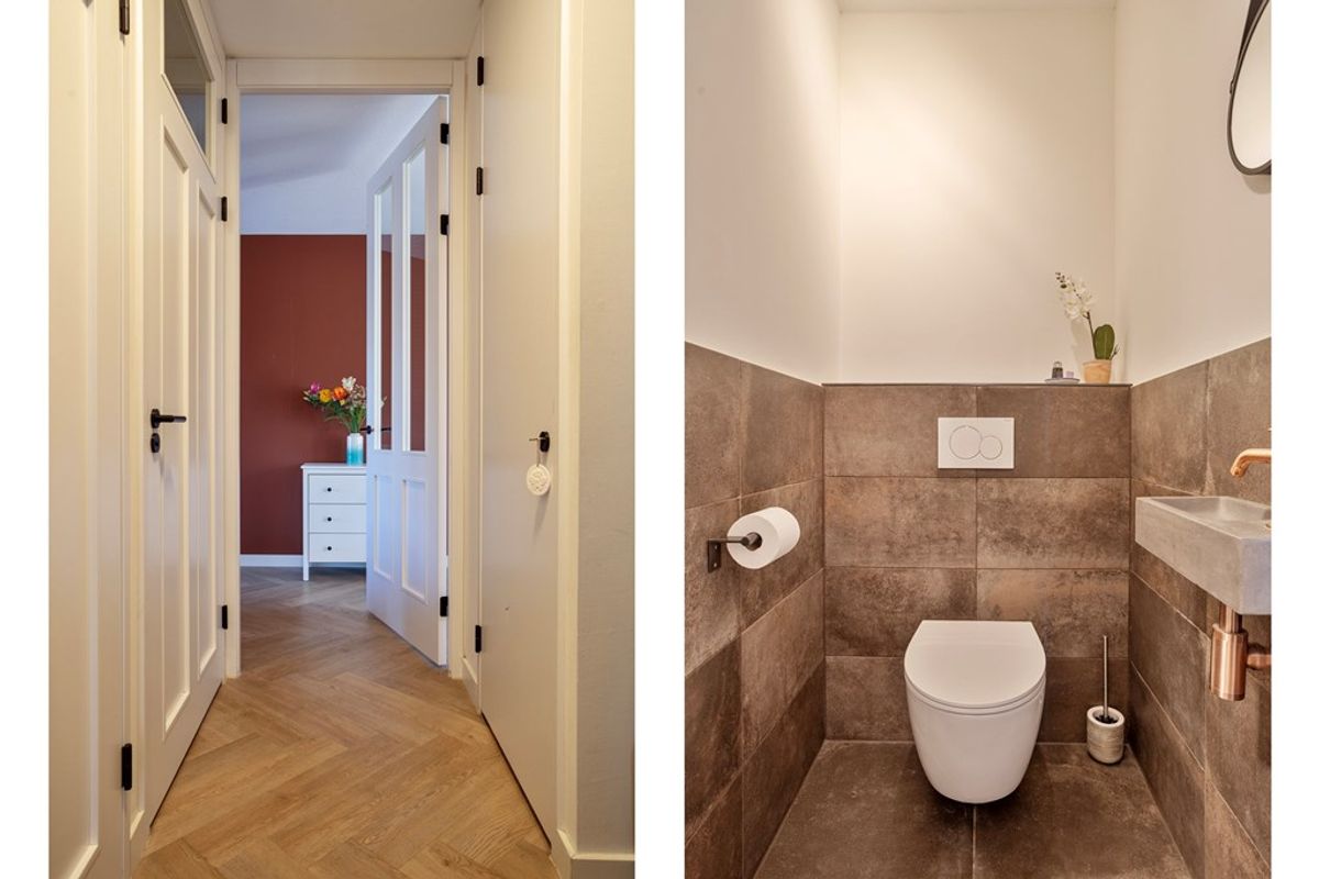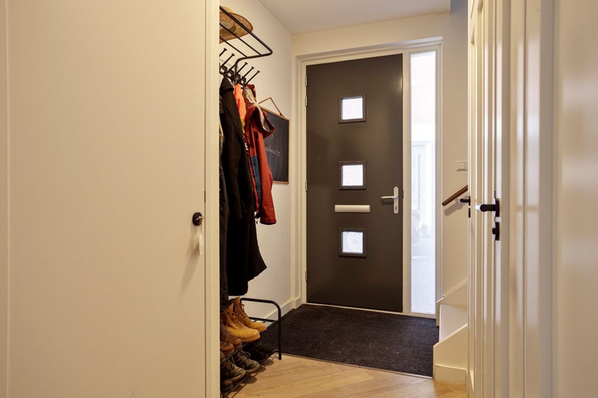 • Entree: aan zijkant van de woning met hierachter de ontvangsthal. In de hal een fraaie pvc-vloer, gelegd in een visgraatmotief, die doorloopt over de gehele begane grond (m.u.v. het toilet). In de hal een trapkast (hier bevindt zich ook de verdeler van de vloerverwarming), trapopgang naar de eerste verdieping, meterkast (12 groepen en 3 aardlek) en het deels betegeld toiletruimte met hangcloset en fonteintje.