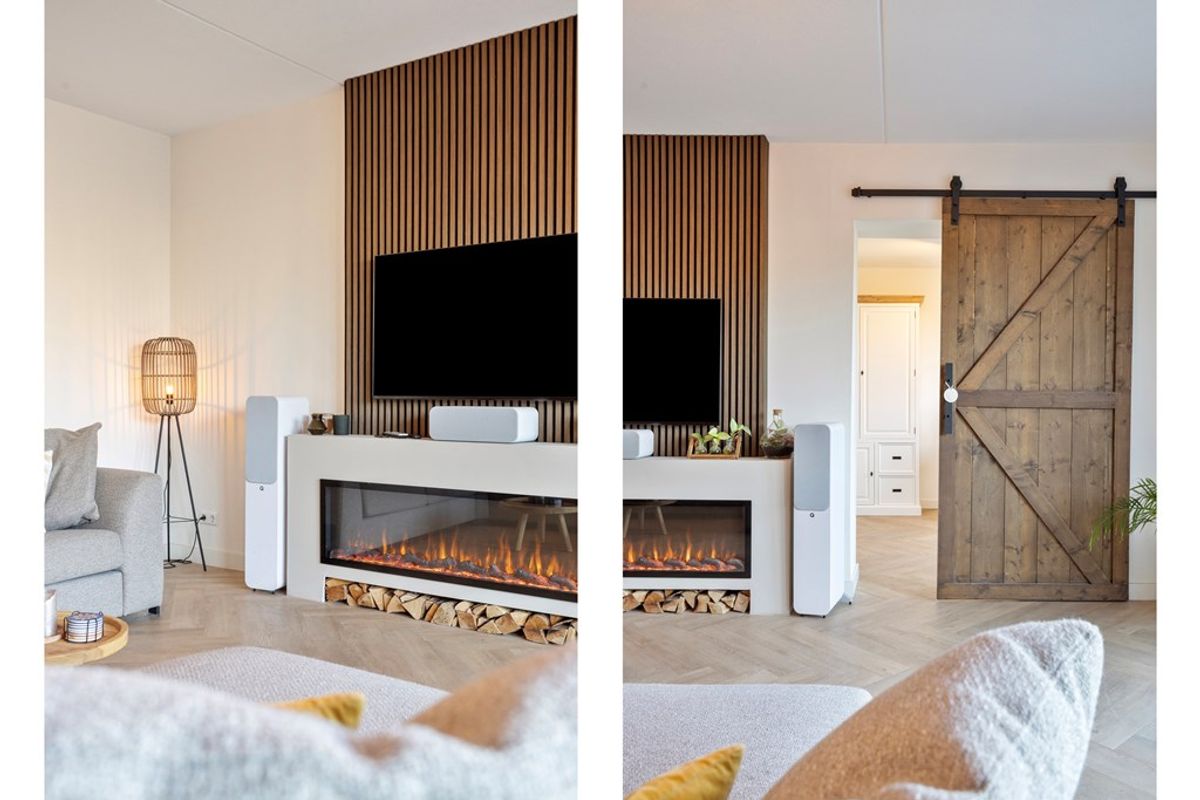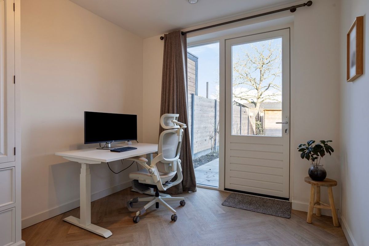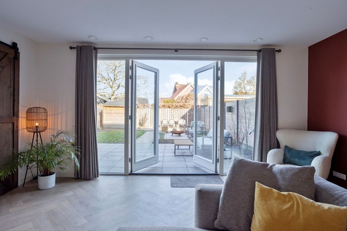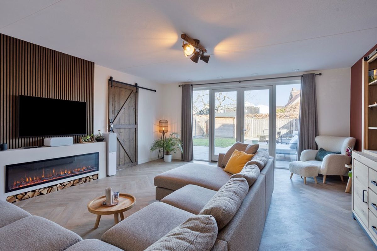 • Woonkamer: Een gezellige woonkamer met veel lichtinval door de grote raampartijen en de dubbele (tuin)deuren. Bij het zitgedeelte een gezellig, ingebouwde sierhaard. Hiernaast een loftdeur die toegang geeft tot een extra kamer, welke de huidige bewoners in gebruik hebben als kantoor. Via het kantoor kom je in de berging.