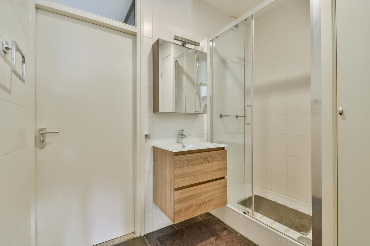 Vanuit de tussenhal zijn verder het toilet v.v. wandcloset en de badkamer te vinden. De badkamer beschikt over een douchecabine, een wastafel met meubel en verlichte spiegelkast en een vaste kast met daarin de boiler. De badkamer en het toilet zijn modern afgewerkt en volledig betegeld.