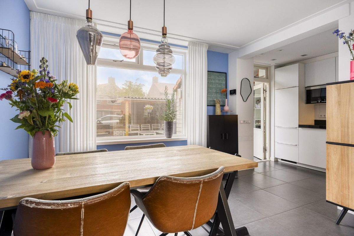 Vanuit het eetgedeelte heb je niet alleen een fijn uitzicht op het groen buiten, maar ook rechtstreeks contact met de open keuken.