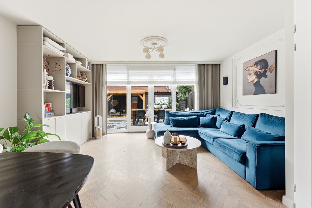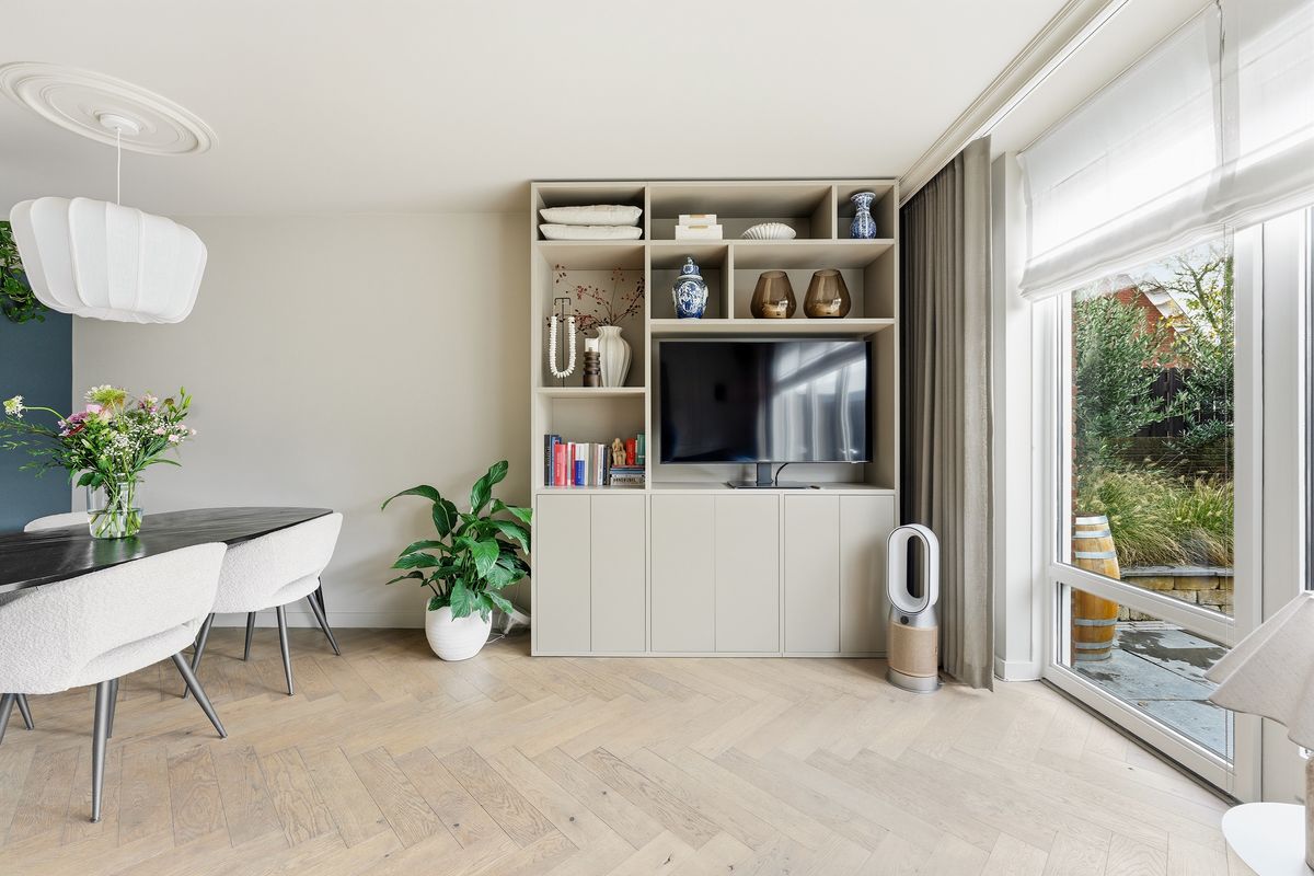 Woonkamer: De woonkamer is echt een plaatje! Het is net of je een Woonmagazine instapt. De woonkamer is tuingericht en heeft openslaande deuren naar de achtertuin. Er is een trapkast aanwezig voor extra bergruimte en een prachtige op maat gemaakte kast (ter overname) voor je tv en accessoires. De kamer voelt ruim en licht aan door de grote glaspartij aan de tuinzijde. De afwerking bestaat uit een houten vloer, gestuukte wanden en houten kozijnen met dubbel glas.