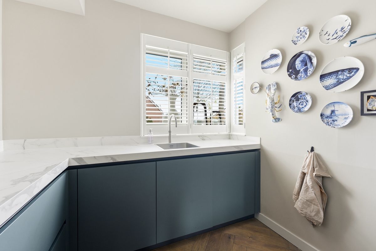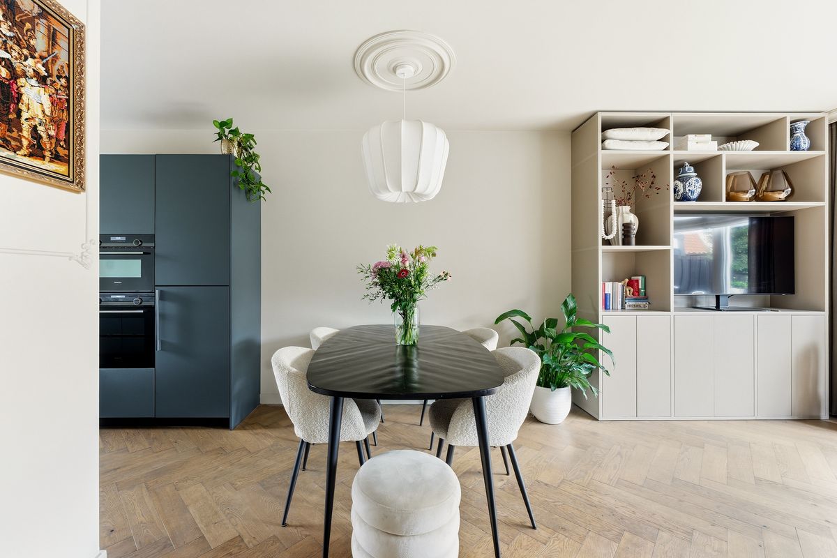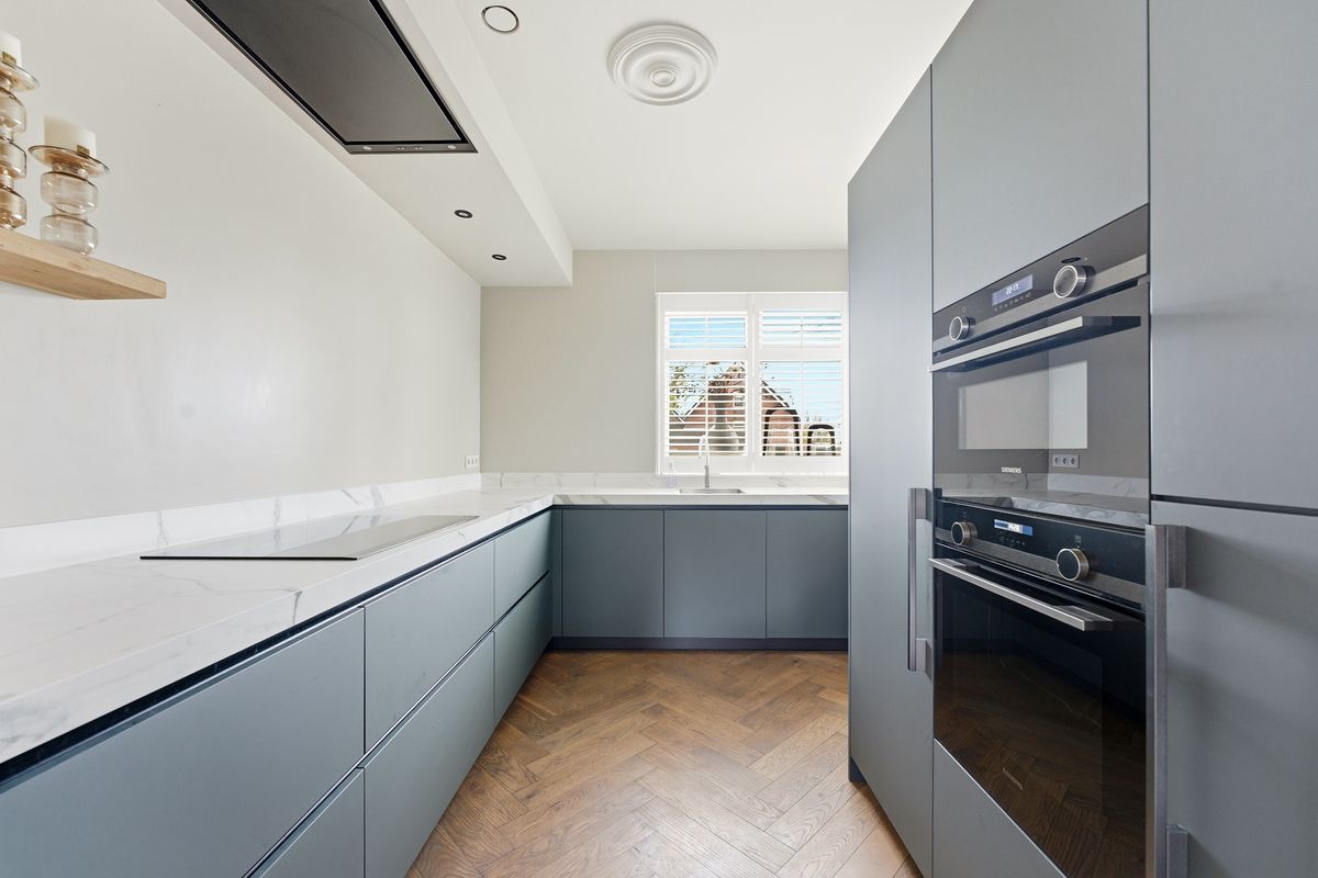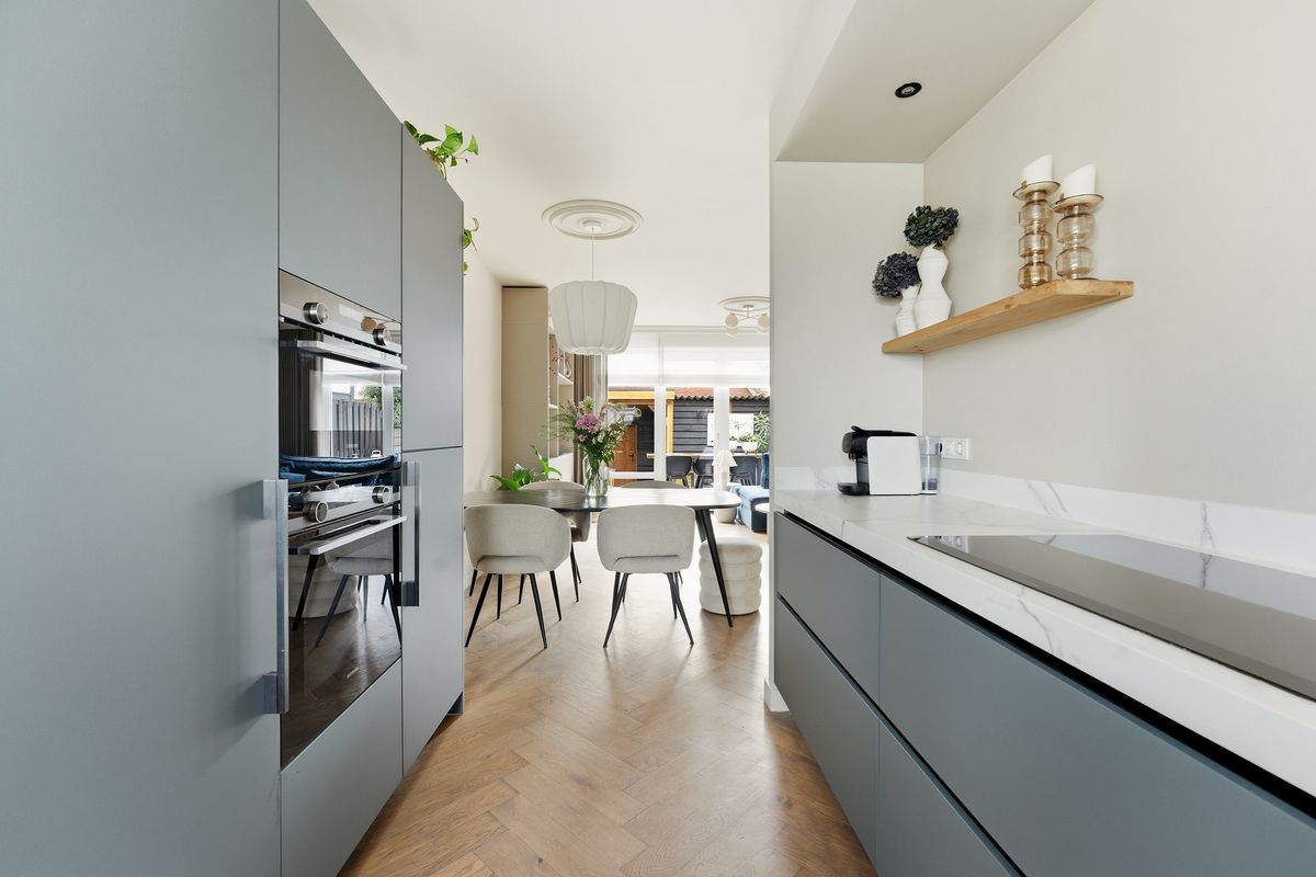 Keuken: De prachtige keuken bevindt zich aan de voorzijde en heeft een ruime opstelling met diverse apparatuur, waaronder een oven, oven-magnetroncombinatie, inductiekookplaat, afzuigkap, koelkast, vriezer, Quooker en vaatwasser. Door het raam aan de voorzijde is er zicht op de straat. De ruimte biedt voldoende werkblad en opbergmogelijkheden. De afwerking sluit volledig aan bij die van de woonkamer.