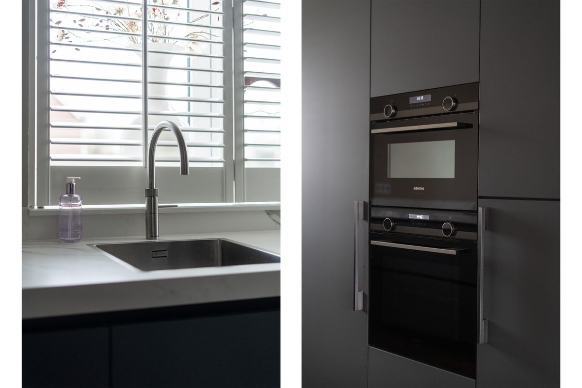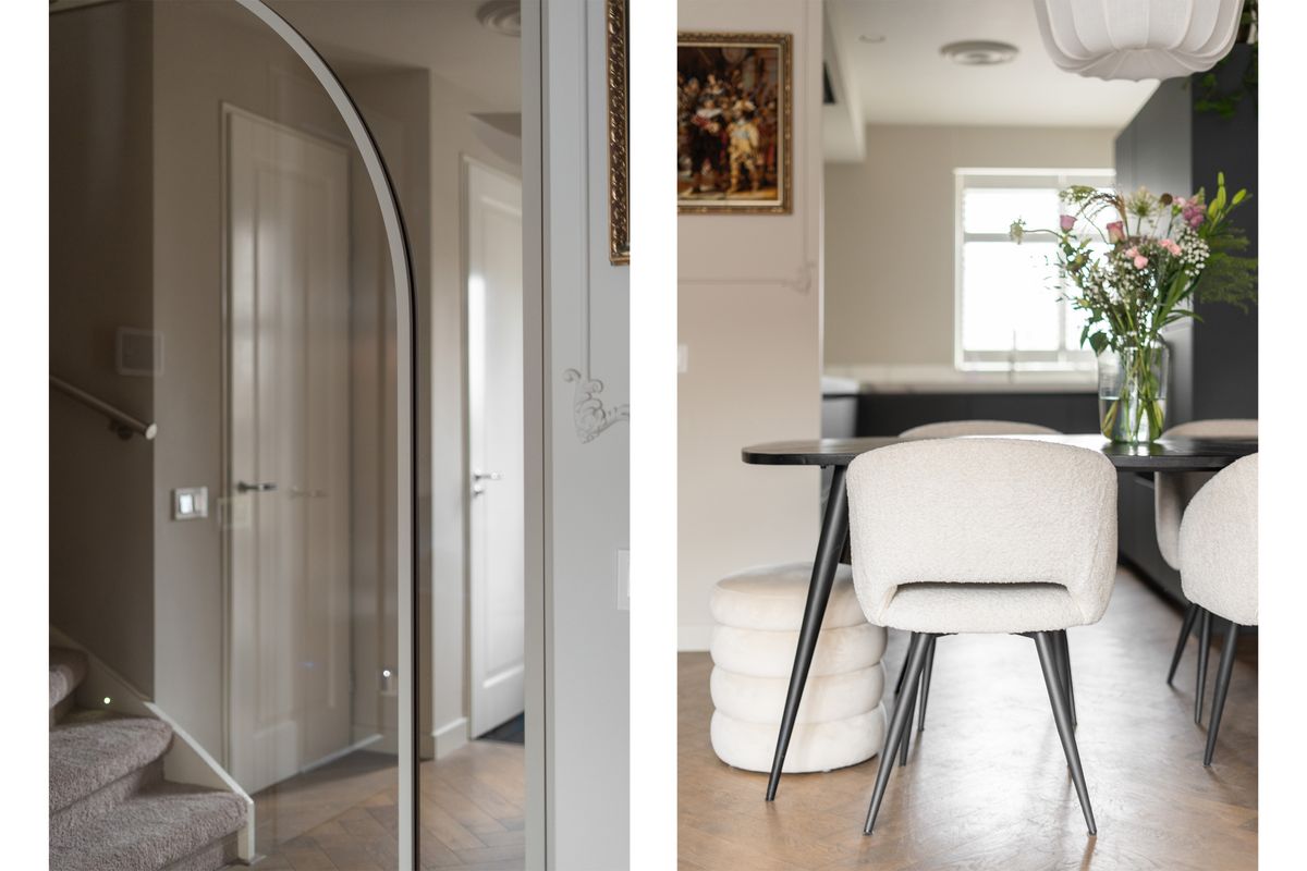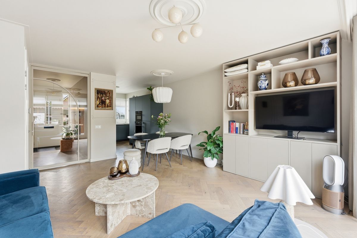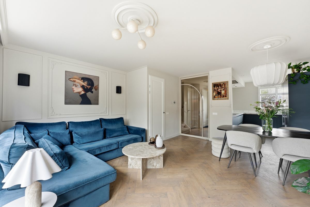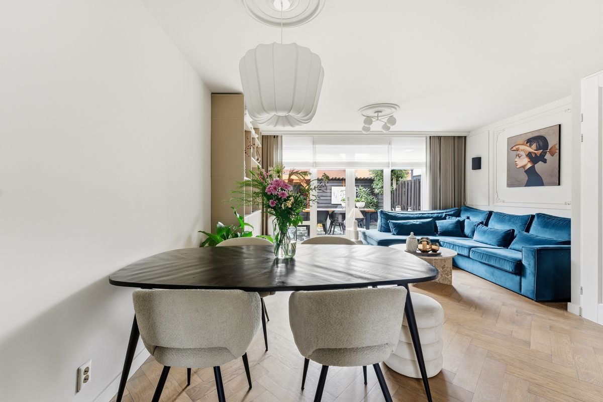Keuken: De prachtige keuken bevindt zich aan de voorzijde en heeft een ruime opstelling met diverse apparatuur, waaronder een oven, oven-magnetroncombinatie, inductiekookplaat, afzuigkap, koelkast, vriezer, Quooker en vaatwasser. Door het raam aan de voorzijde is er zicht op de straat. De ruimte biedt voldoende werkblad en opbergmogelijkheden. De afwerking sluit volledig aan bij die van de woonkamer.