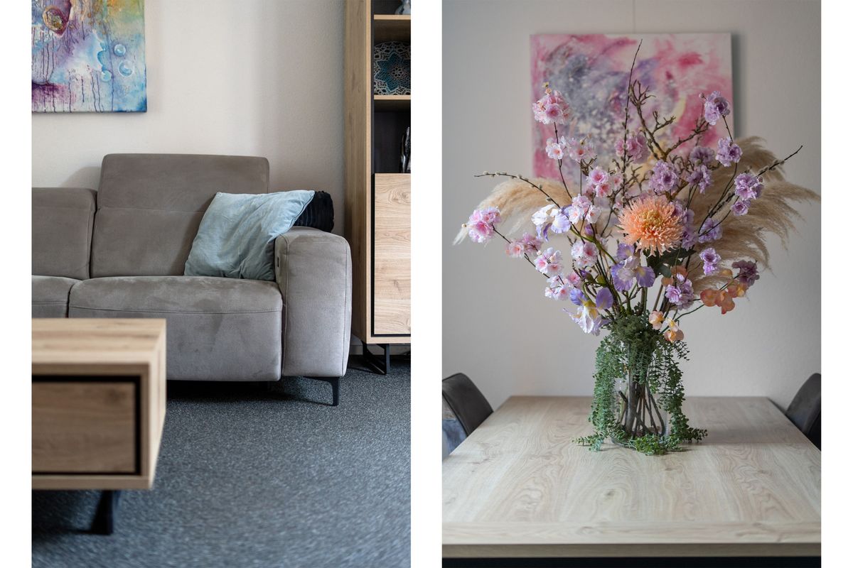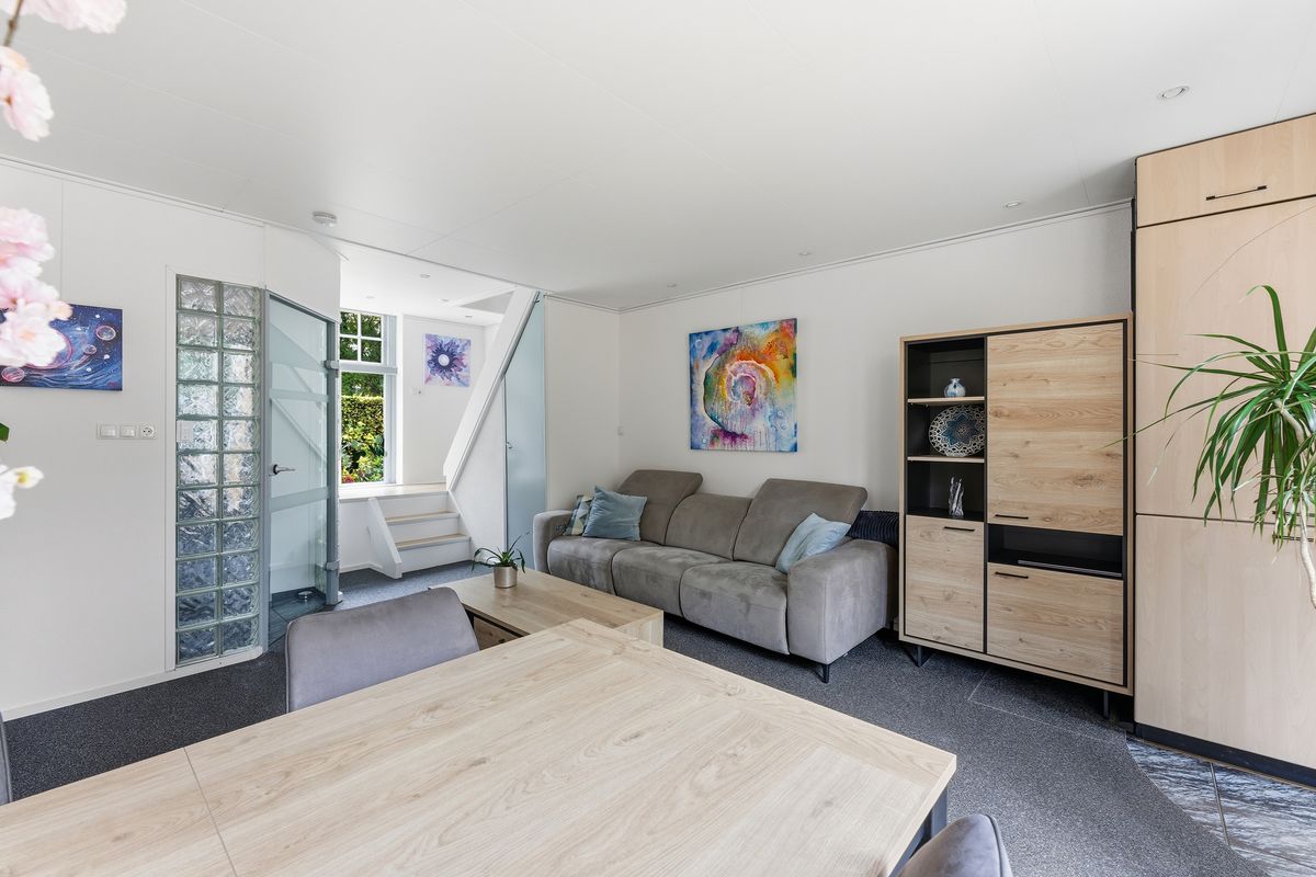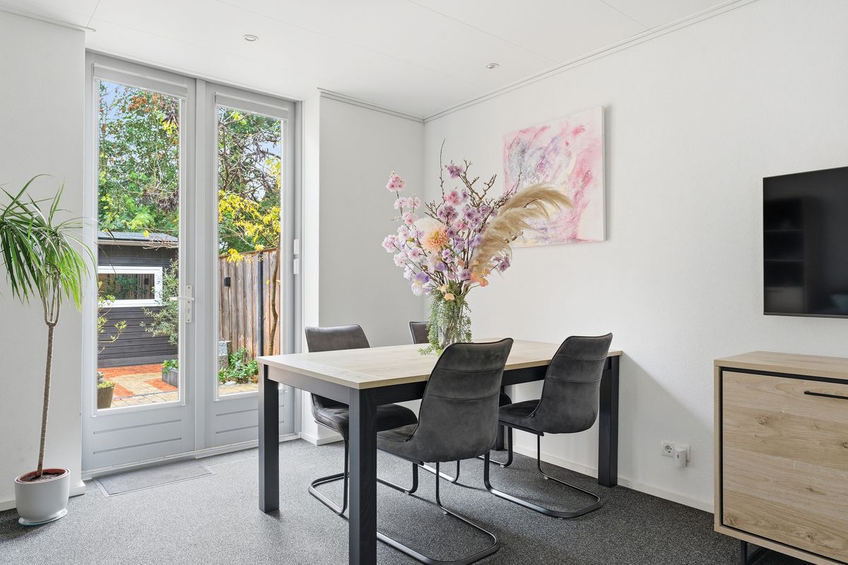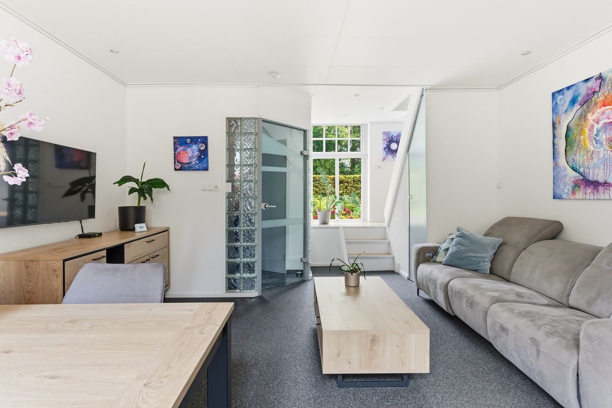 Woonkamer: De gezellige woonkamer heeft openslaande deuren naar de tuin die voor veel lichtinval en een fijne verbinding met buiten zorgen. Onder de trap is extra bergruimte gecreëerd, handig voor het opbergen van spullen. De mooie karakteristieke ramen met roedeverdeling geven extra sfeer. De open trap naar boven geeft de ruimte een speels karakter en de vloerverwarming zorgt voor een behaaglijke temperatuur. De woonkamer is afgewerkt met een leefgrindvloer, spachtelputz wanden en houten kozijnen met dubbel glas.