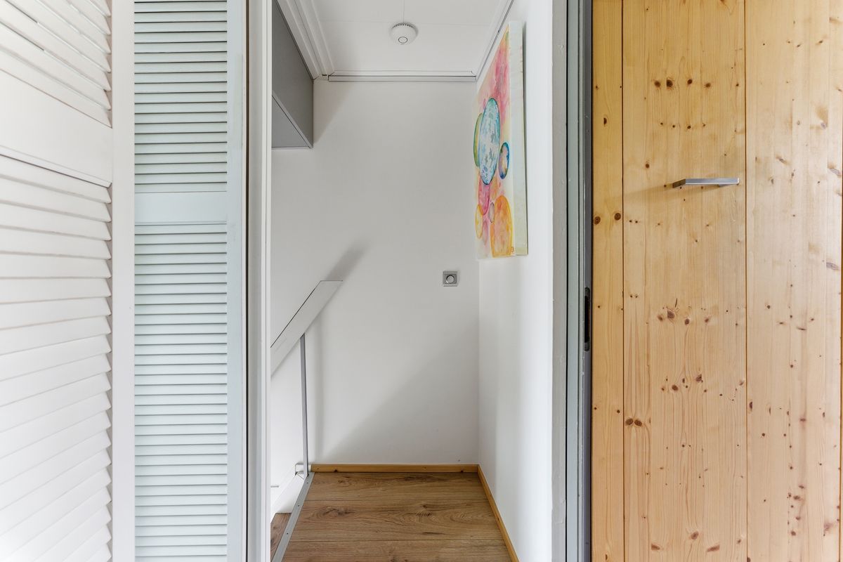Slaapkamer 1 (achterzijde): Deze kamer met dakkapel is een gezellige slaapkamer. Er is een trap naar de zolder, een schuifdeur om ruimte te besparen en een inbouwkast met verlichting onder de trap. Het verlaagde plafond heeft een praktische ruimte om dekens of kussens in op te bergen.