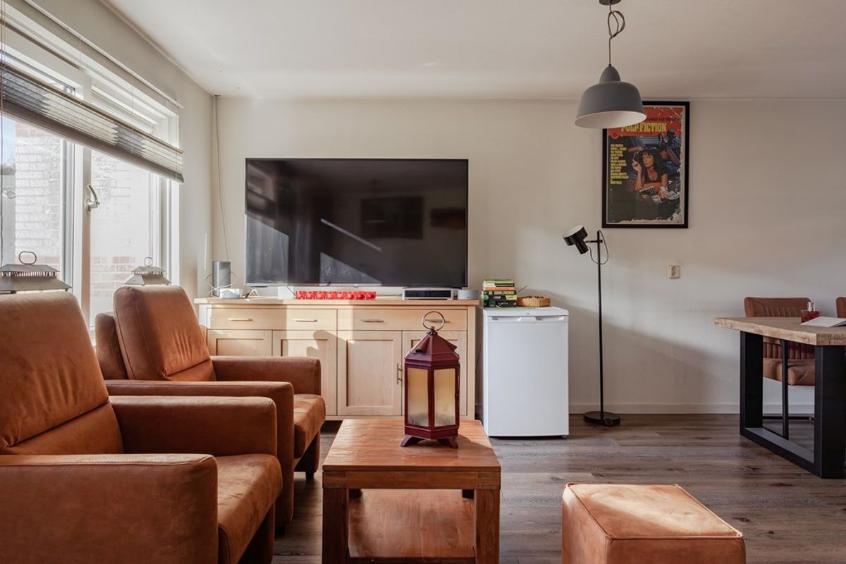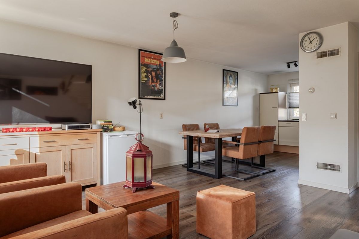 Tuingerichte living waar de sfeervolle pvc-vloer vanuit de hal is doorgelegd. De wanden zijn gespoten en in 2021 zijn de kozijnen van de begane grond vervangen, uitgevoerd in duurzaam kunststof met HR++ glas. De tuindeur, ook uitgevoerd in kunststof geeft toegang tot de zonnig gelegen tuin en er is een draai/kiepraam met ventilatierooster en hor zodat er goed geventileerd kan worden. De living wordt verwarmd door een hete luchtinstallatie dus geen stoffige radiatoren.