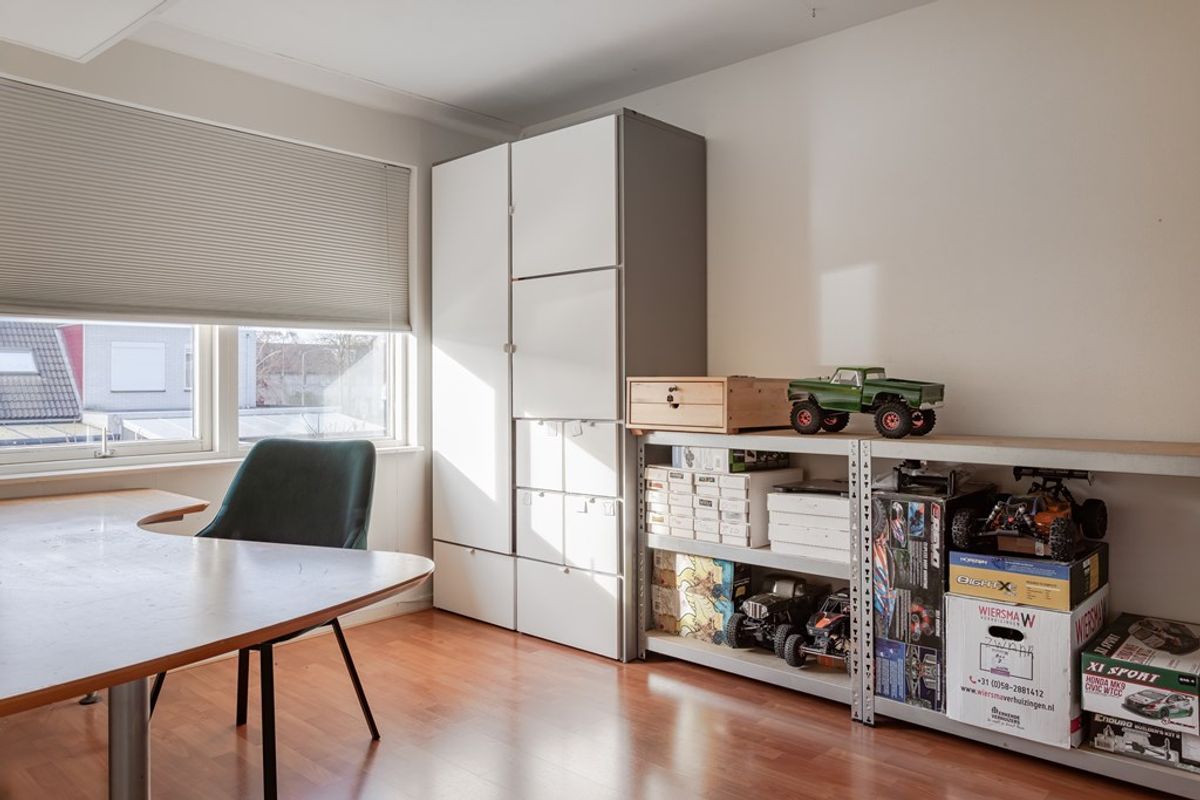 3e Slaapkamer voorzijde – ruime kamer met gestuukte wanden, bergruimte achter het knieschot en een groot Velux raam, uitgevoerd in kunststof, met verduisteringsgordijn en een screen aan de buitenzijde.