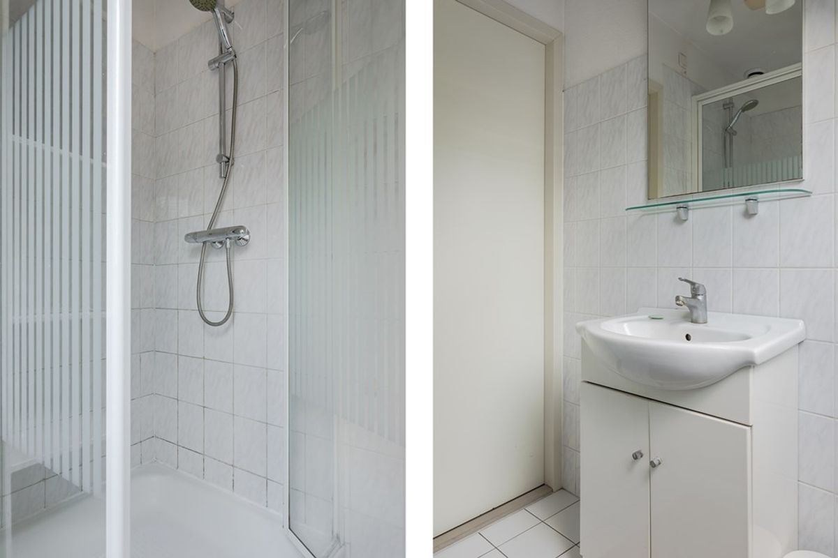 De badkamer heeft licht betegelde wanden en dito vloer, een douchehoek met glazen deuren en thermostaatkraan (2023), 2e toilet en een wastafelmeubeltje met porseleinen wasbak.