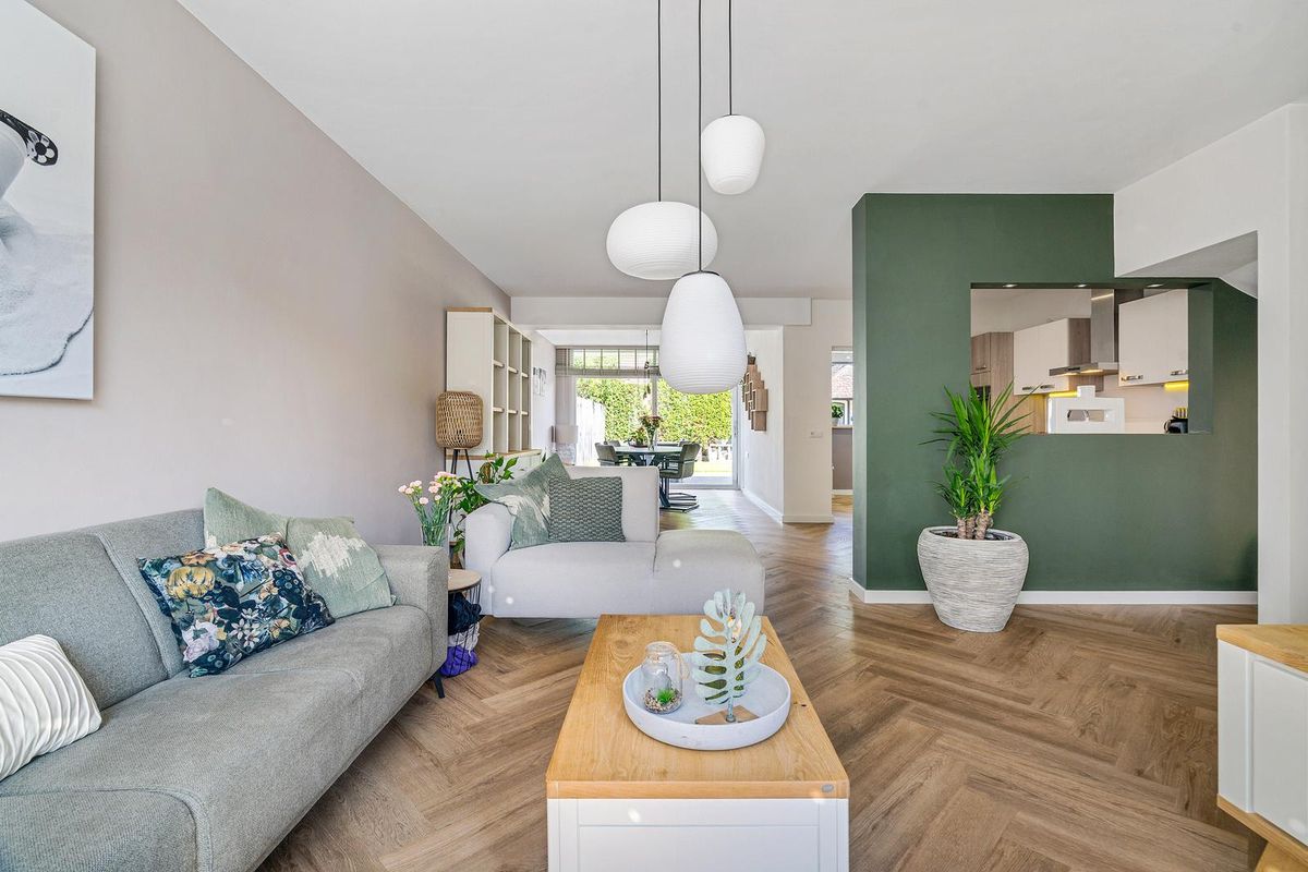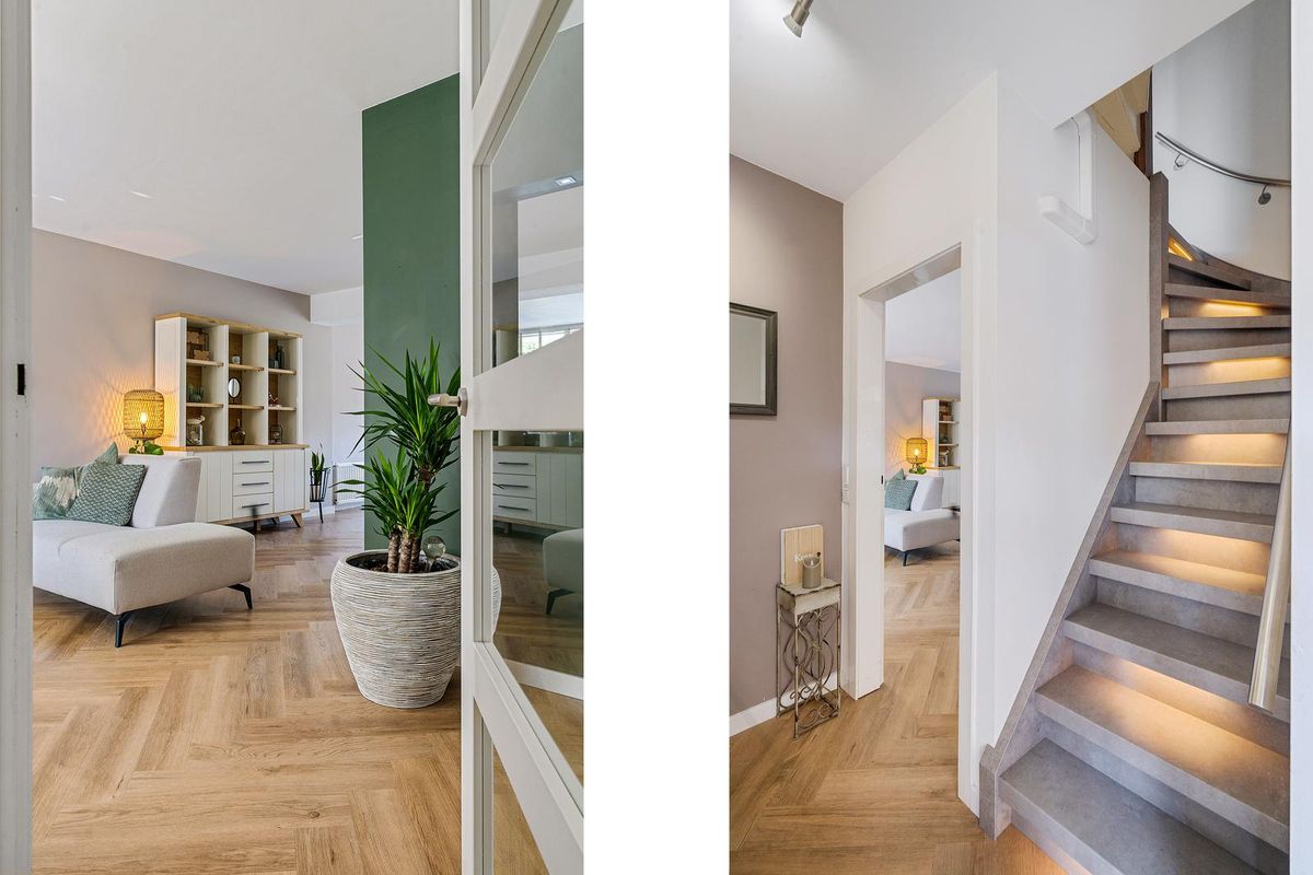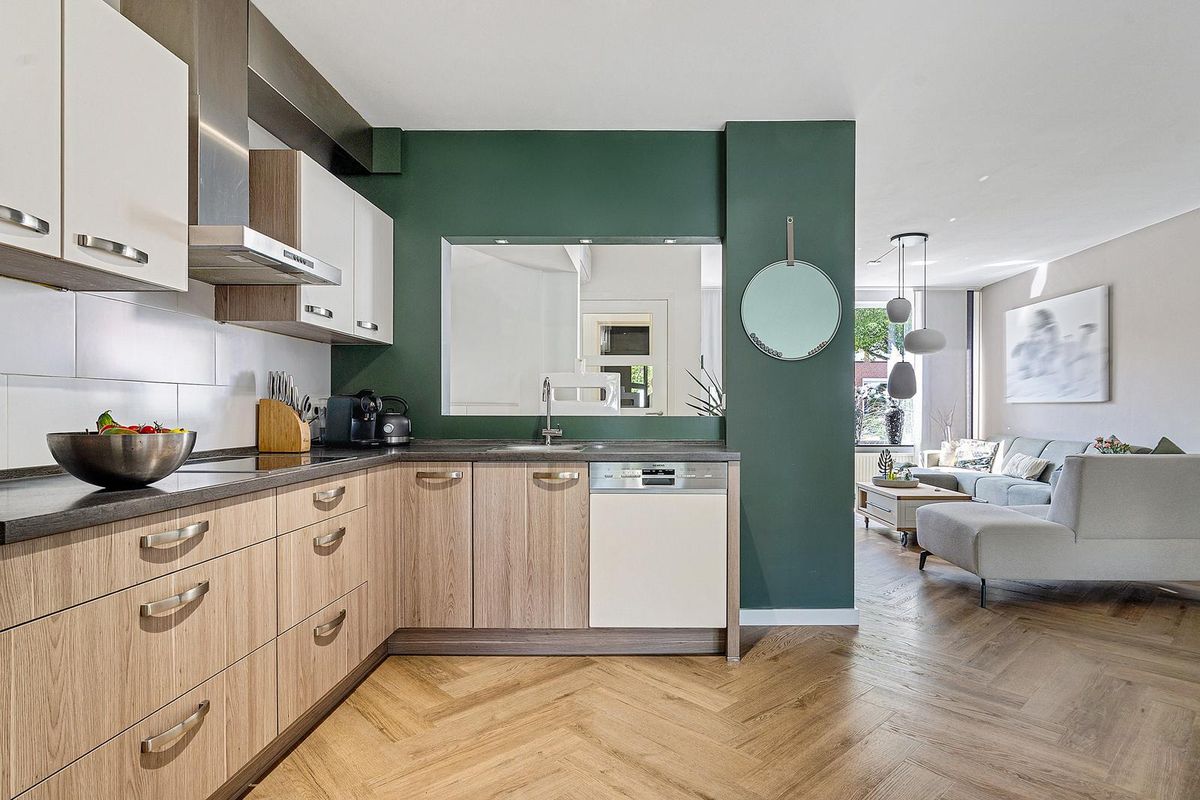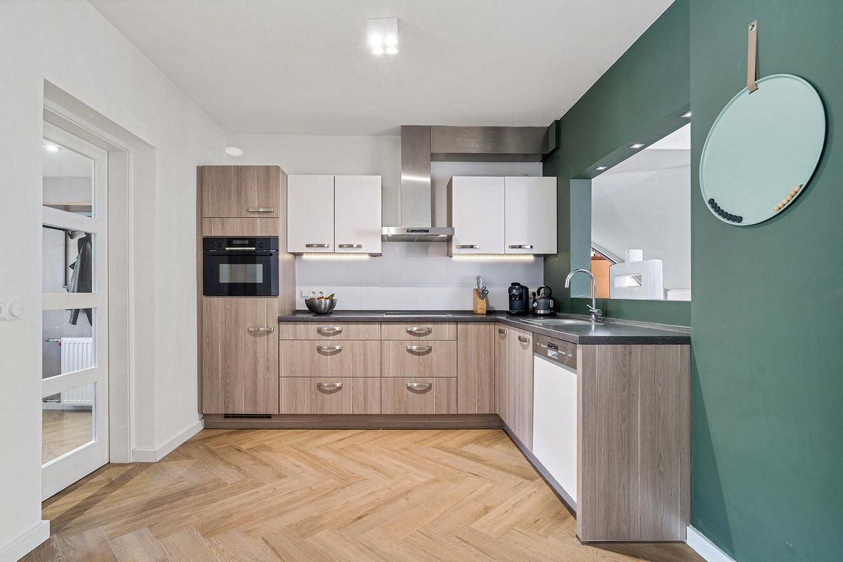 Via de entreehal met meterkast en modern toilet met fonteintje betreedt u de lichte woonkamer. De prachtige visgraat PVC-vloer loopt stijlvol door naar de open keuken, die is uitgerust met een aanbouwkeuken voorzien van alle denkbare gemakken (o.a. keramische kookplaat met wasemkap, vaatwasser, combi-oven en koelkast). Achter de keuken is nog een multifunctionele ruimte, geschikt als kantoor of als bijkeuken. Deze biedt tevens toegang tot de garage,