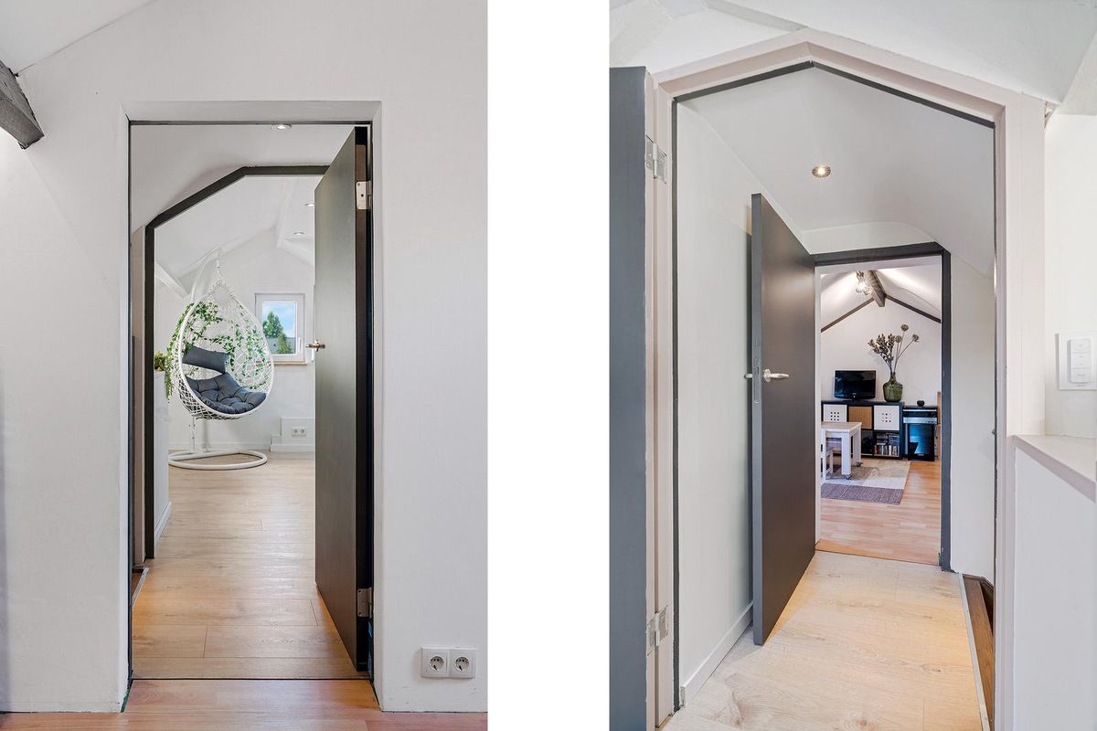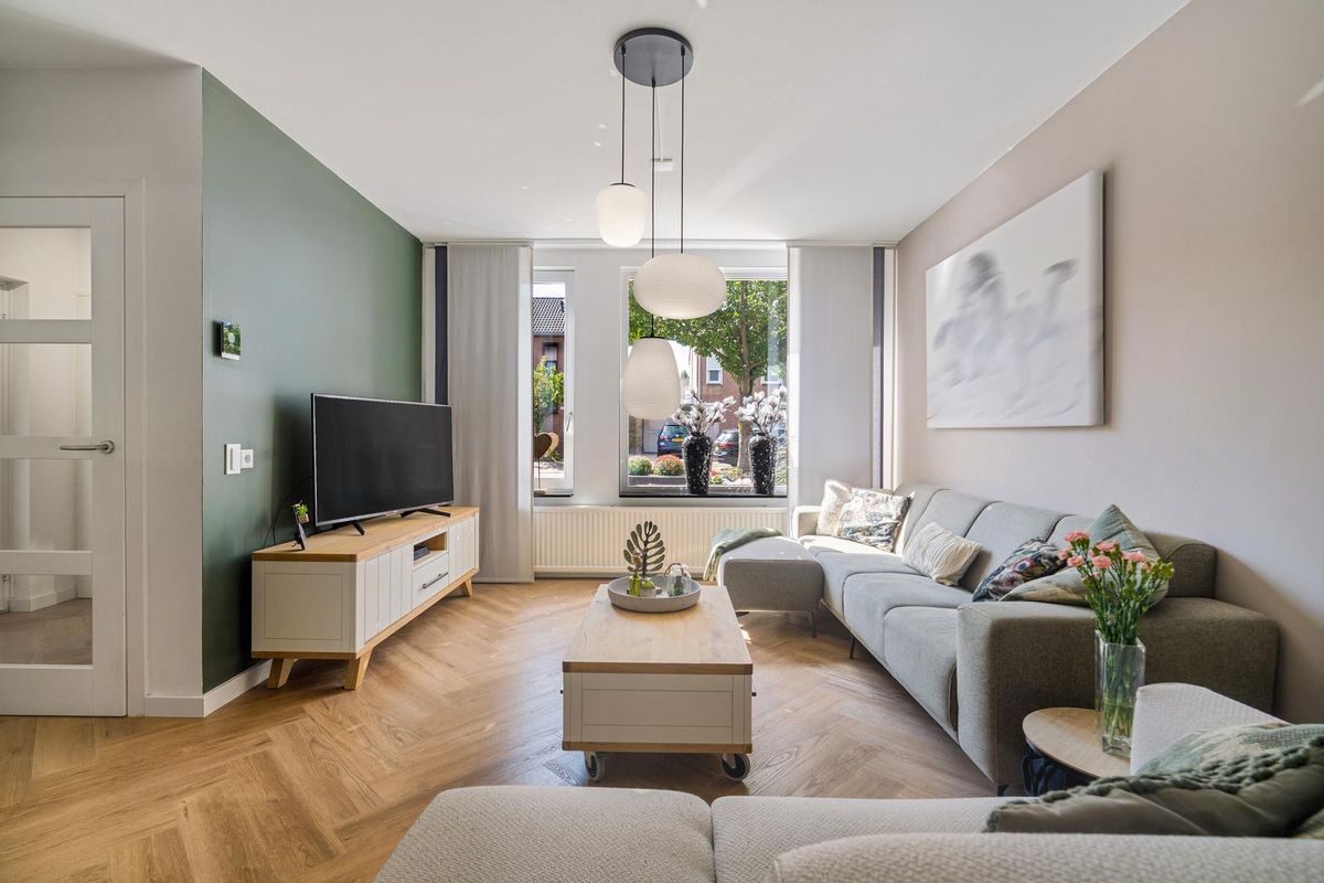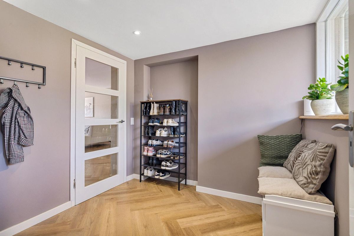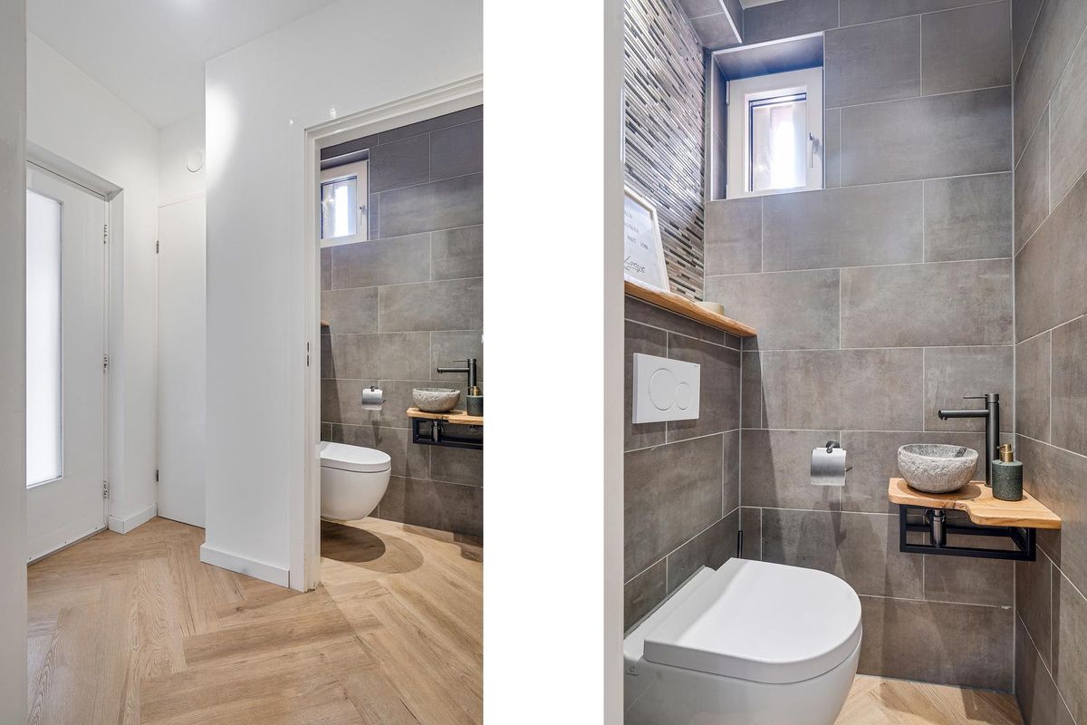 Via de entreehal met meterkast en modern toilet met fonteintje betreedt u de lichte woonkamer. De prachtige visgraat PVC-vloer loopt stijlvol door naar de open keuken, die is uitgerust met een aanbouwkeuken voorzien van alle denkbare gemakken (o.a. keramische kookplaat met wasemkap, vaatwasser, combi-oven en koelkast). Achter de keuken is nog een multifunctionele ruimte, geschikt als kantoor of als bijkeuken. Deze biedt tevens toegang tot de garage,